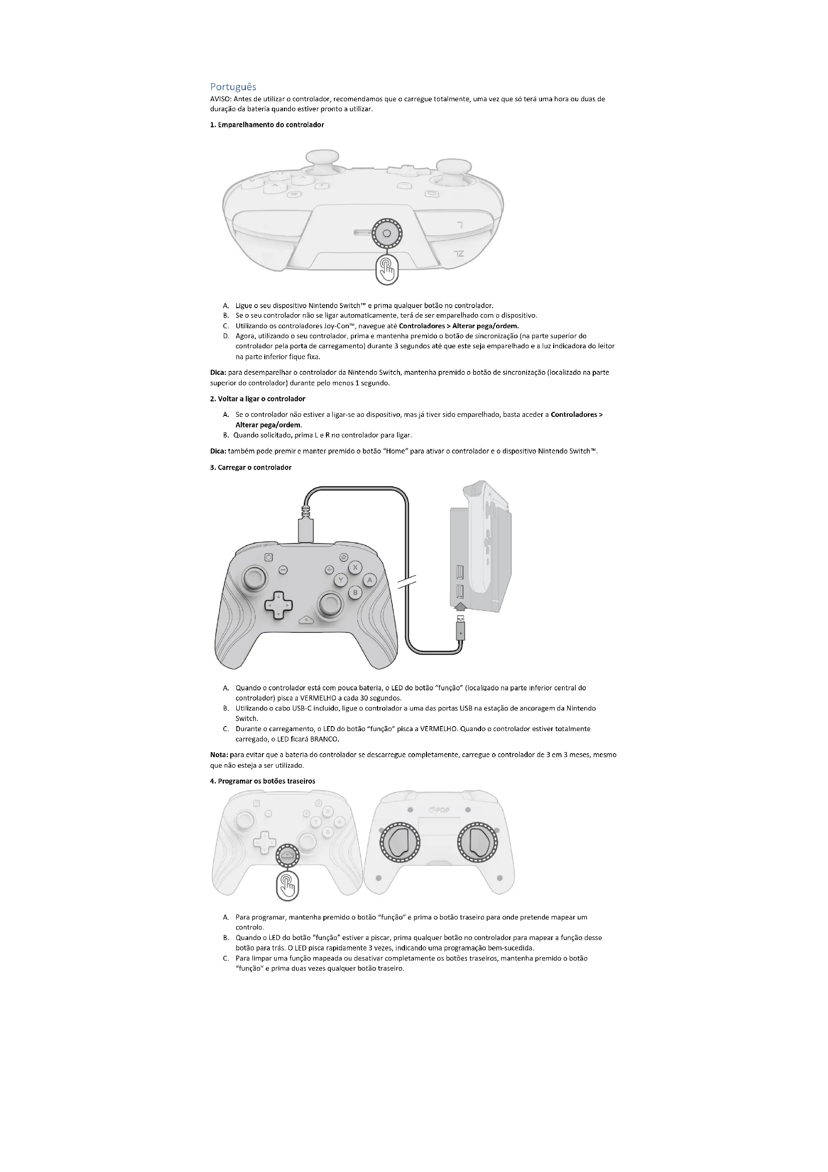 A. Quando o controlador está com pouca bateria, o LED do botão “função” (localizado na parte inferior central do controlador) pisca a VERMELHO a cada 30 segundos. B. Utilizando o cabo USB-C incluído, ligue o controlador a uma das portas USB na estação de ancoragem da Nintendo Switch. C. Durante o carregamento, o LED do botão “função” pisca a VERMELHO. Quando o controlador estiver totalmente carregado, o LED ficará BRANCO. Nota: para evitar que a bateria do controlador se descarregue completamente, carregue o controlador de 3 em 3 meses, mesmo que não esteja a ser utilizado.