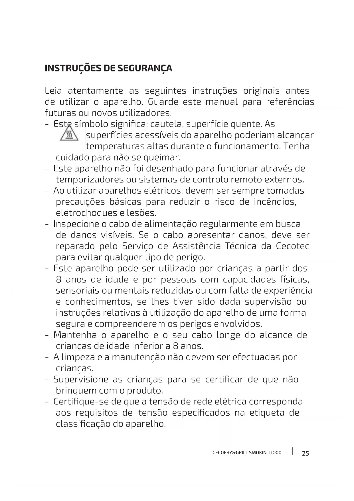 Leia atentamente as seguintes instruções originais antes de utilizar o aparelho. Guarde este manual para referências futuras ou novos utilizadores. - Este símbolo signica: cautela, superfície quente. As superfícies acessíveis do aparelho poderiam alcançar temperaturas altas durante o funcionamento. Tenha cuidado para não se queimar. - Este aparelho não foi desenhado para funcionar através de temporizadores ou sistemas de controlo remoto externos. - Ao utilizar aparelhos elétricos, devem ser sempre tomadas precauções básicas para reduzir o risco de incêndios, eletrochoques e lesões. - Inspecione o cabo de alimentação regularmente em busca de danos visíveis. Se o cabo apresentar danos, deve ser reparado pelo Serviço de Assistência Técnica da Cecotec para evitar qualquer tipo de perigo. - Este aparelho pode ser utilizado por crianças a partir dos 8 anos de idade e por pessoas com capacidades físicas, sensoriais ou mentais reduzidas ou com falta de experiência e conhecimentos, se lhes tiver sido dada supervisão ou instruções relativas à utilização do aparelho de uma forma segura e compreenderem os perigos envolvidos. - Mantenha o aparelho e o seu cabo longe do alcance de crianças de idade inferior a 8 anos. - A limpeza e a manutenção não devem ser efectuadas por crianças. - Supervisione as crianças para se certicar de que não brinquem com o produto. - Certique-se de que a tensão de rede elétrica corresponda aos requisitos de tensão especicados na etiqueta de classicação do aparelho.CECOFRY&GRILL SMOKIN’ 11O00