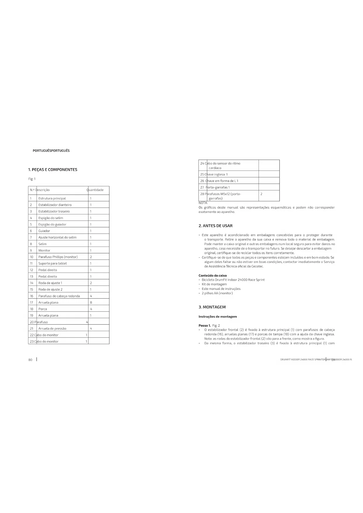 Fig. 1 N.º Descrição Quantidade 1 Estrutura principal 1 2 Estabilizador dianteiro 1 3 Estabilizador traseiro 1 4 Espigão do selim 1 5 Espigão do guiador 1 6 Guiador 1 7 Ajuste horizontal do selim 1 8 Selim 1 9 Monitor 1 10 Parafuso Phillips (monitor) 2 11 Suporte para tablet 1 12 Pedal direito 1 13 Pedal direito 1 14 Roda de ajuste 1 2 15 Roda de ajuste 2 1 16 Parafuso de cabeça redonda 4 17 Arruela plana 8 18 Porca 4 19 Arruela plana 1 20 Parafuso 4 21 Arruela de pressão 4 22 Cabo do monitor 1 23 Cabo do monitor 1DRUMFIT INDOOR 24000 RACE SPRINTDRUMFIT INDOOR 24000 RACE SPRINT