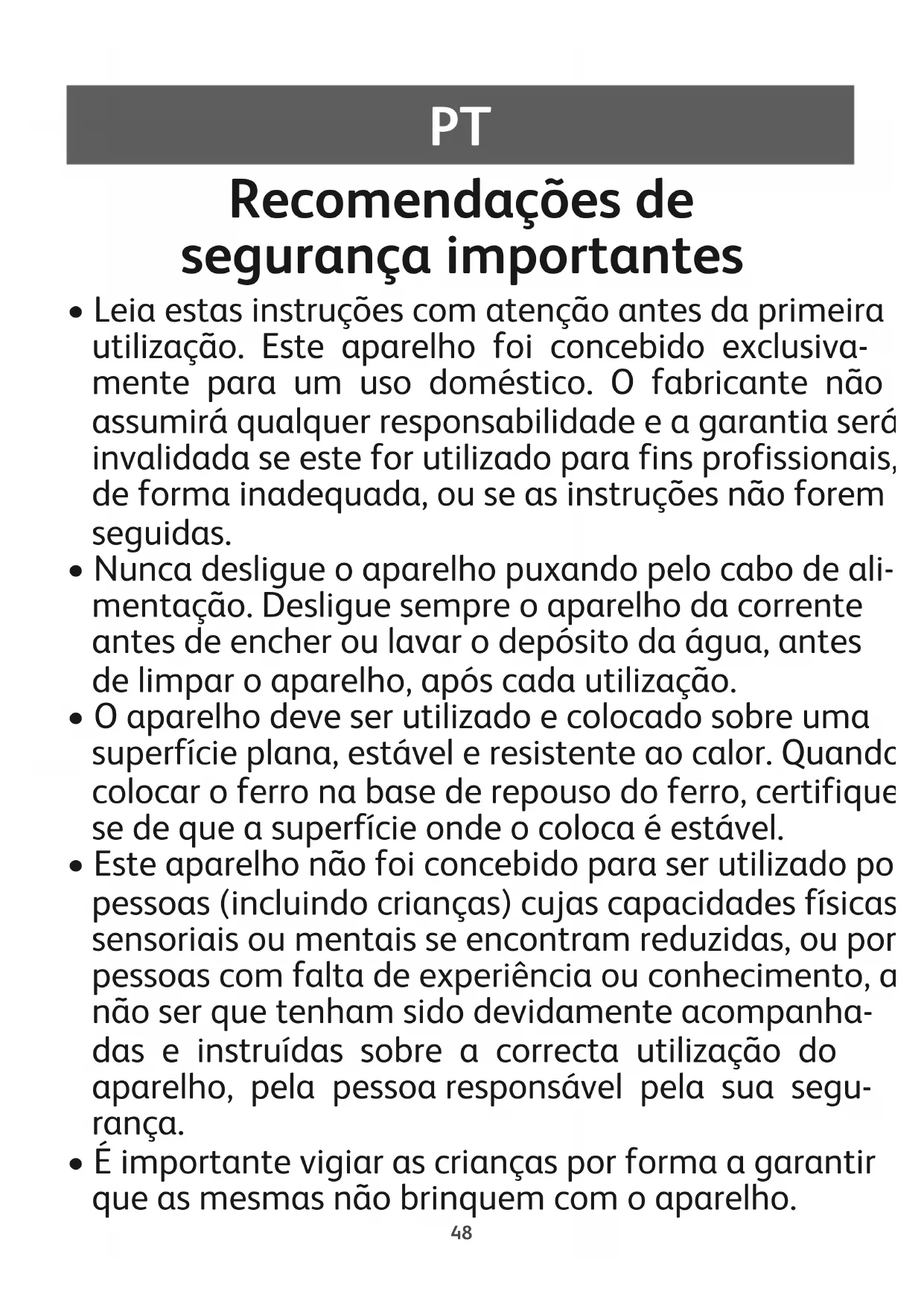 - Leia estas instruções com atenção antes da primeira utilização. Este aparelho foi concebido exclusiva- mente para um uso doméstico. O fabricante não assumirá qualquer responsabilidade e a garantia será invalidada se este for utilizado para fins profissionais, de forma inadequada, ou se as instruções não forem seguidas.