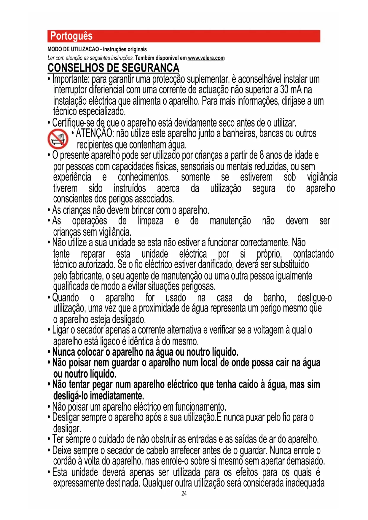Portoguês MODO DE UTILIZACAO - Instruções originais Ler com atenção as seguintes instruções. Também disponível em www.valera.com