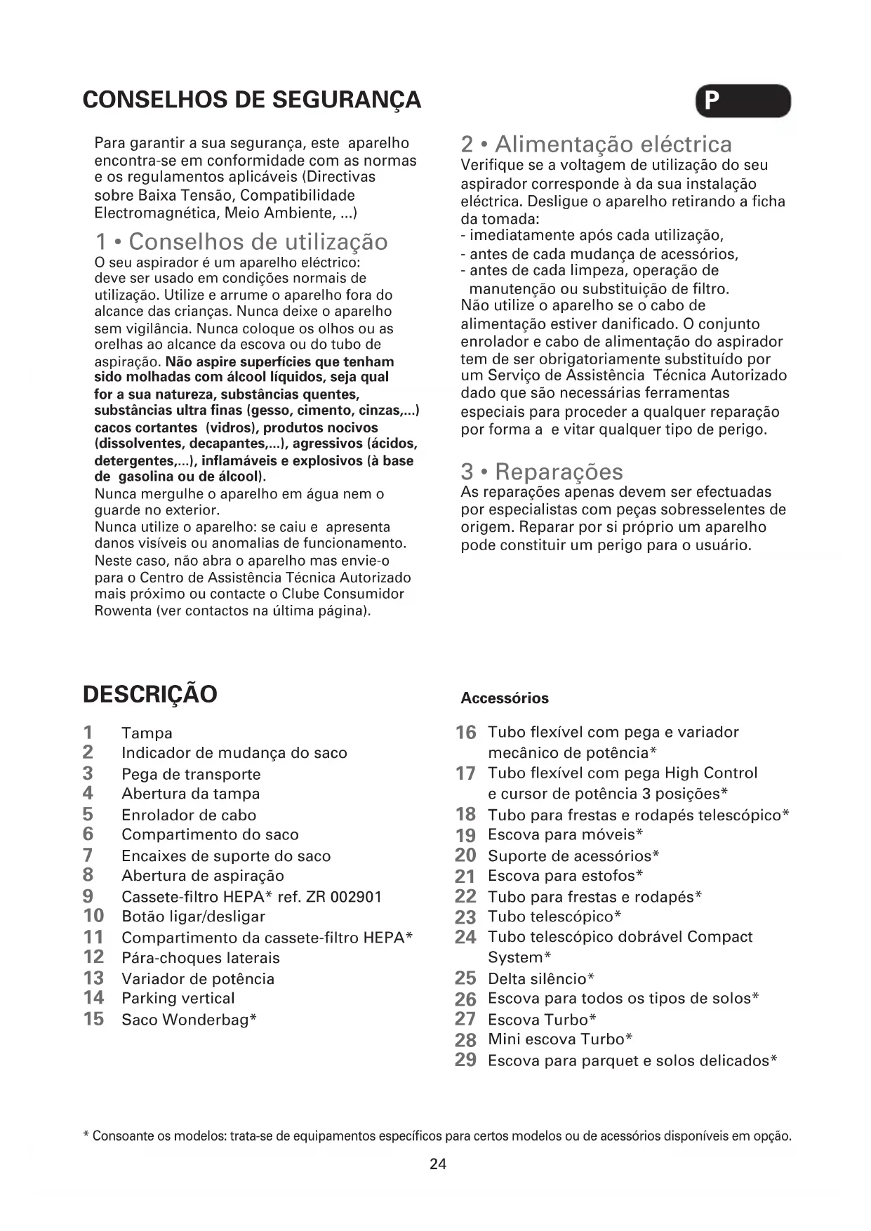 DESCRIÇÃO Tampa Indicador de mudança do saco Pega de transporte Abertura da tampa Enrolador de cabo Compartimento do saco Encaixes de suporte do saco Abertura de aspiração Cassete-filtro HEPA* ref. ZR 002901 Botão ligar/desligar Compartimento da cassete-filtro HEPA* Pára-choques laterais Variador de potência Parking vertical Saco Wonderbag* Tubo exível com pega e variador mecânico de potência* Tubo exível com pega High Control e cursor de potência 3 posições* Tubo para frestas e rodapés telescópico* Escova para móveis* Suporte de acessórios* Escova para estofos* Tubo para frestas e rodapés* Tubo telescópico* Tubo telescópico dobrável Compact System* Delta silêncio* Escova para todos os tipos de solos* Escova Turbo* Mini escova Turbo* Escova para parquet e solos delicados* Accessórios