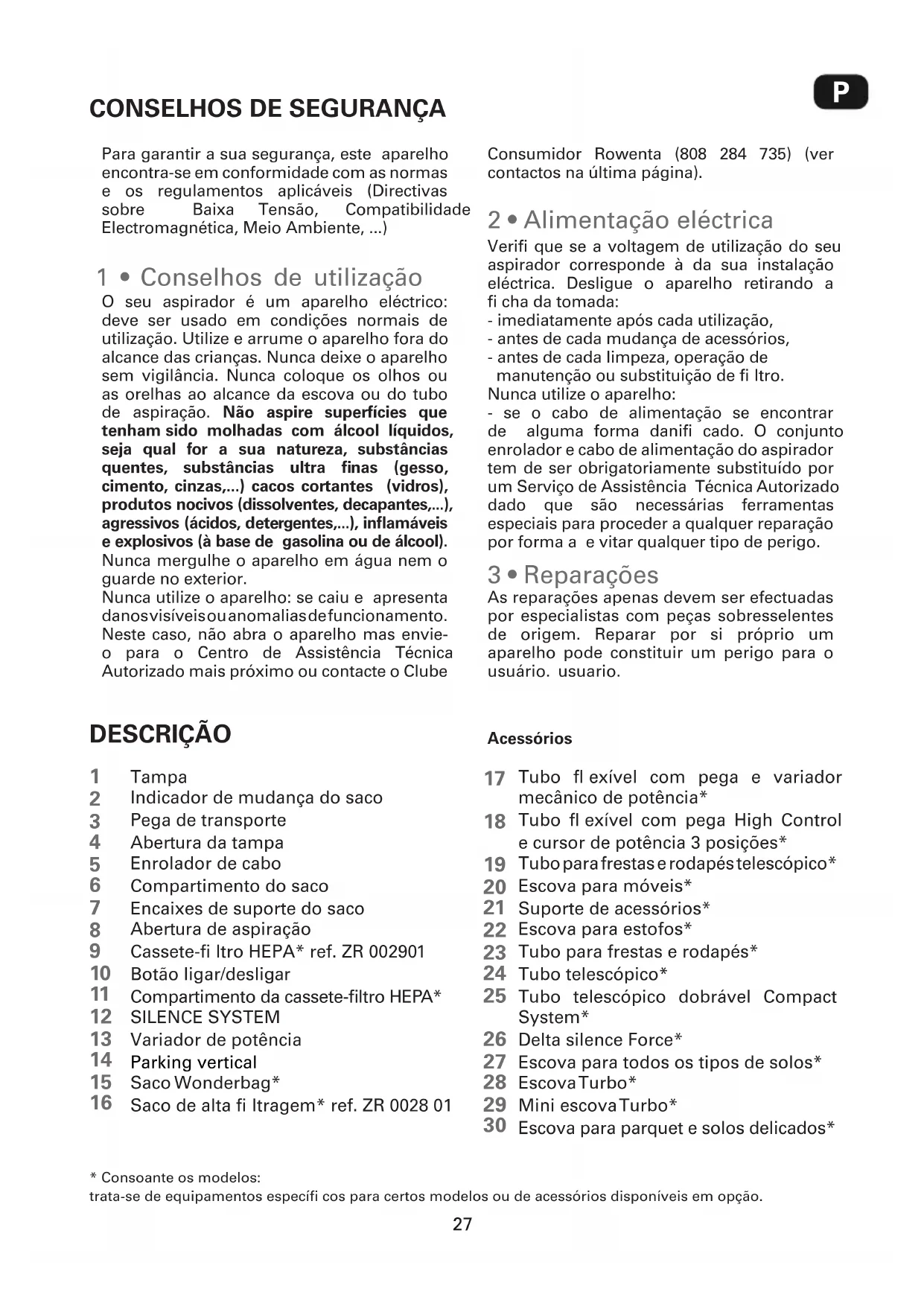 1 • Conselhos de utilização DESCRIÇÃO Tampa Indicador de mudança do saco Pega de transporte Abertura da tampa Enrolador de cabo Compartimento do saco Encaixes de suporte do saco Abertura de aspiração Cassete-fi ltro HEPA* ref. ZR 002901 Botão ligar/desligar Compartimento da cassete-fi ltro HEPA* SILENCE SYSTEM Variador de potência Parking vertical Saco Wonderbag* Saco de alta fi ltragem* ref. ZR 0028 01 Tubo fl exível com pega e variador mecânico de potência* Tubo fl exível com pega High Control e cursor de potência 3 posições* Tubo para frestas e rodapés telescópico* Escova para móveis* Suporte de acessórios* Escova para estofos* Tubo para frestas e rodapés* Tubo telescópico* Tubo telescópico dobrável Compact System* Delta silence Force* Escova para todos os tipos de solos* Escova Turbo* Mini escova Turbo* Escova para parquet e solos delicados*