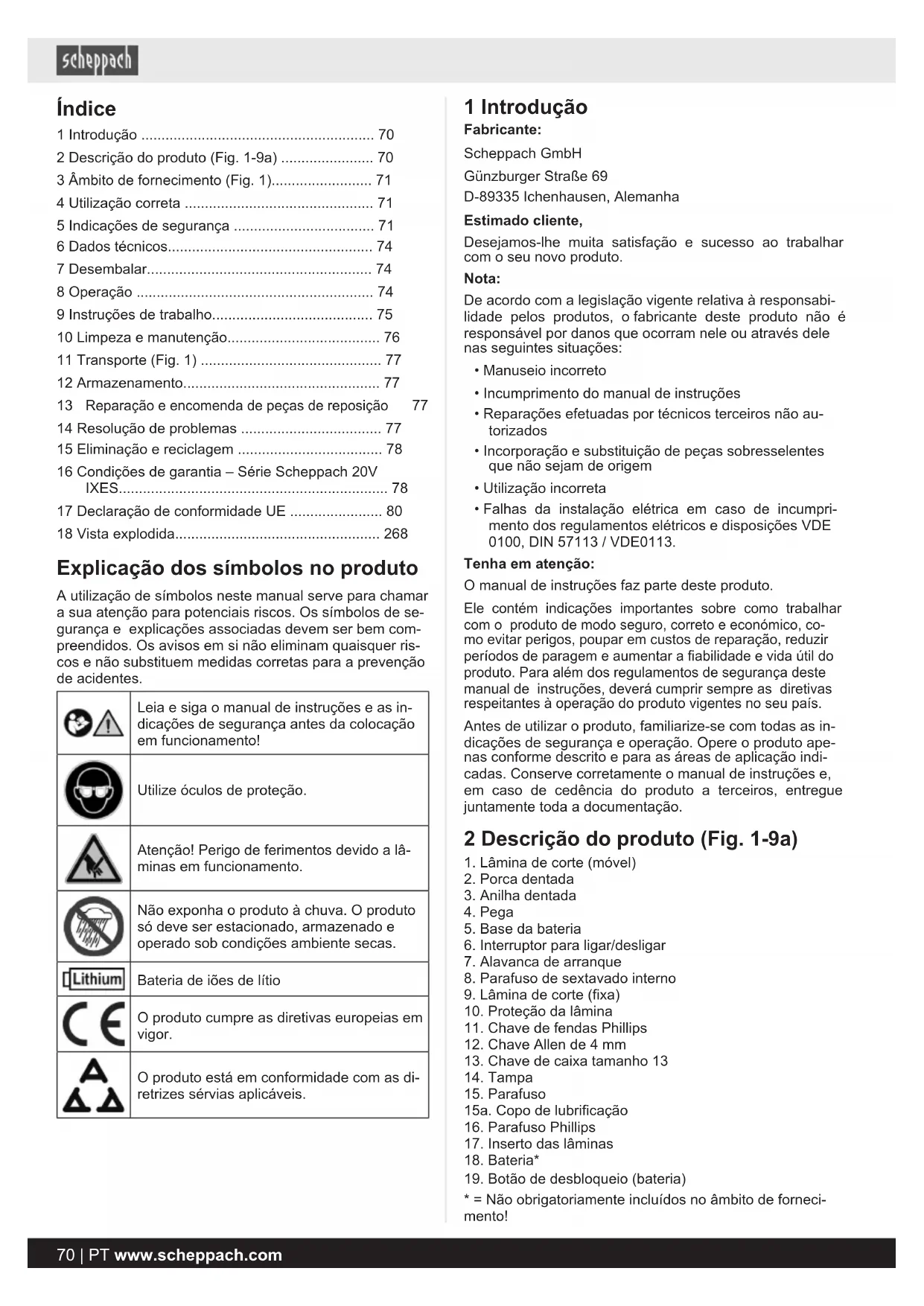 - 18 Vista explodida Explicação dos símbolos no produto A utilização de símbolos neste manual serve para chamar a sua atenção para potenciais riscos. Os símbolos de se- gurança e explicações associadas devem ser bem com- preendidos. Os avisos em si não eliminam quaisquer ris- cos e não substituem medidas corretas para a prevenção de acidentes. Leia e siga o manual de instruções e as in- dicações de segurança antes da colocação em funcionamento! Utilize óculos de proteção. Atenção! Perigo de ferimentos devido a lâ- minas em funcionamento. Não exponha o produto à chuva. O produto só deve ser estacionado, armazenado e operado sob condições ambiente secas. Bateria de iões de lítio O produto cumpre as diretivas europeias em vigor. O produto está em conformidade com as di- retrizes sérvias aplicáveis. 1 Introdução Fabricante: Scheppach GmbH Günzburger Straße 69 D-89335 Ichenhausen, Alemanha Estimado cliente, Desejamos-lhe muita satisfação e sucesso ao trabalhar com o seu novo produto. Nota: De acordo com a legislação vigente relativa à responsabi- lidade pelos produtos, o fabricante deste produto não é responsável por danos que ocorram nele ou através dele nas seguintes situações: p. 268