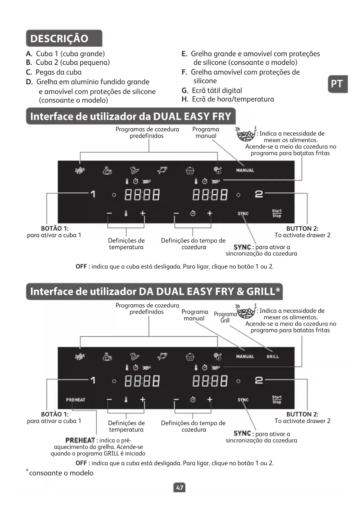 DESCRIÇÃO A. Cuba 1 (cuba grande) B. Cuba 2 (cuba pequena) C. Pegas da cuba D. Grelha em alumínio fundido grande e amovível com proteções de silicone (consoante o modelo) E. Grelha grande e amovível com proteções de silicone (consoante o modelo) F. Grelha amovível com proteções de silicone G. Ecrã tátil digital H. Ecrã de hora/temperatura Interface de utilizador da DUAL EASY FRY Interface de utilizador DA DUAL EASY FRY & GRILL* OFF : indica que a cuba está desligada. Para ligar, clique no botão 1 ou 2. OFF : indica que a cuba está desligada. Para ligar, clique no botão 1 ou 2. : indica o pré- aquecimento da grelha. Acende-se quando o programa GRILL é iniciado