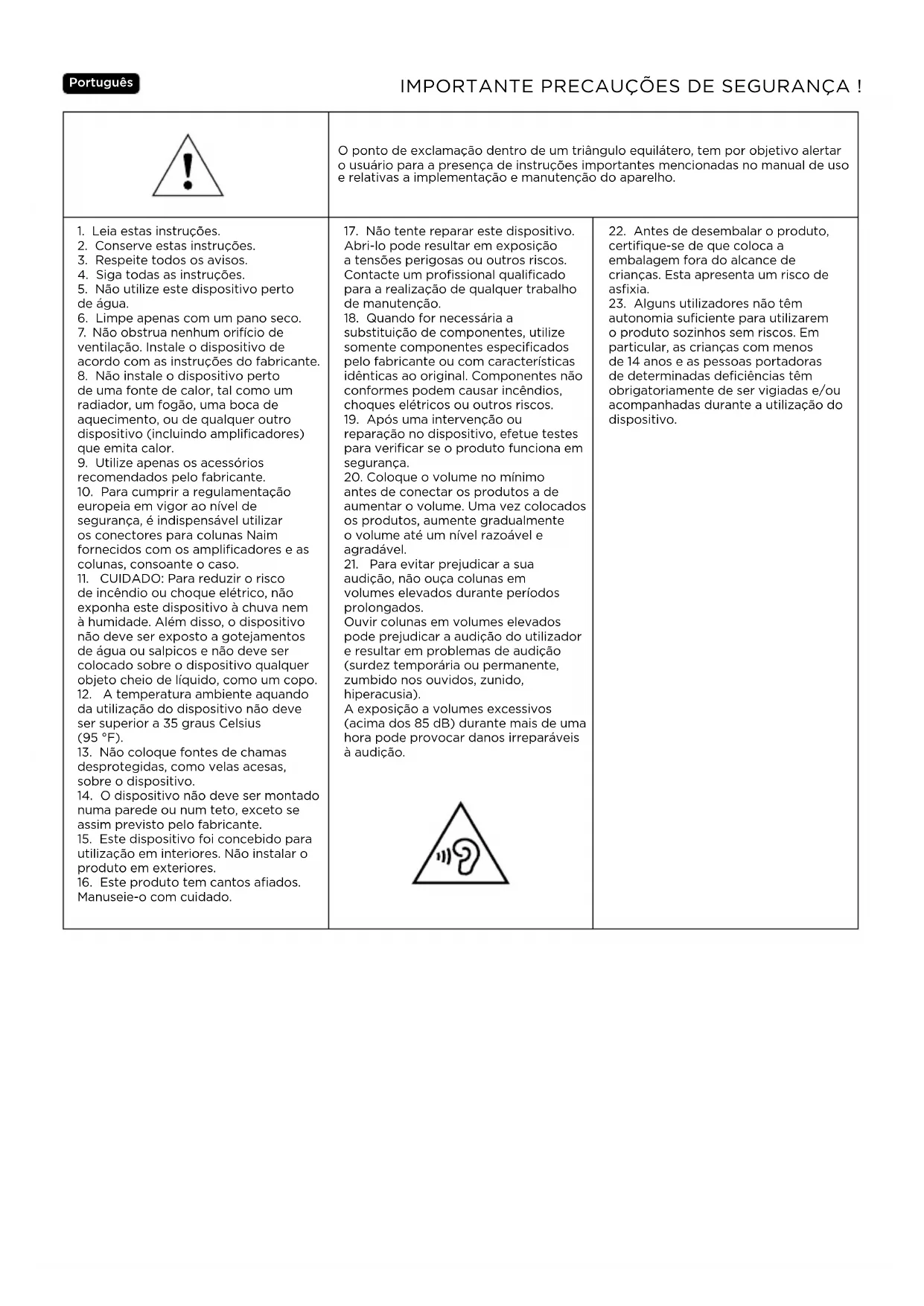 audição, não ouça colunas em volumes elevados durante períodos prolongados. Ouvir colunas em volumes elevados pode prejudicar a audição do utilizador e resultar em problemas de audição (surdez temporária ou permanente, zumbido nos ouvidos, zunido, hiperacusia). A exposição a volumes excessivos (acima dos 85 dB) durante mais de uma hora pode provocar danos irreparáveis à audição.