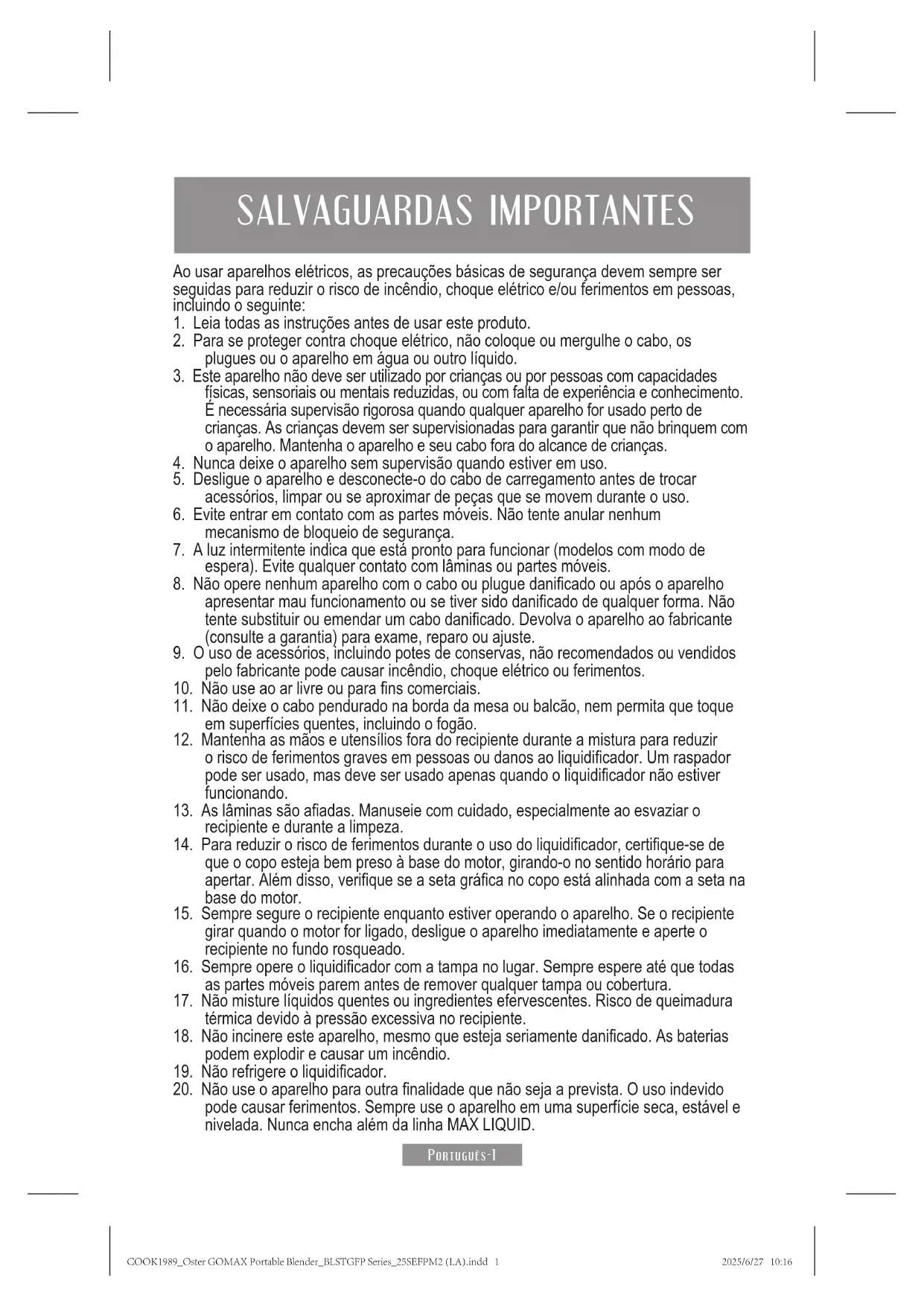 pode causar ferimentos. Sempre use o aparelho em uma superfície seca, estável e nivelada. Nunca encha além da linha MAX LIQUID. COOK1989_Oster GOMAX Portable Blender_BLSTGFP Series_25SEFPM2 (LA).indd 1COOK1989_Oster GOMAX Portable Blender_BLSTGFP Series_25SEFPM2 (LA).indd 1 2025/6/27 10:162025/6/27 10:16Português-2