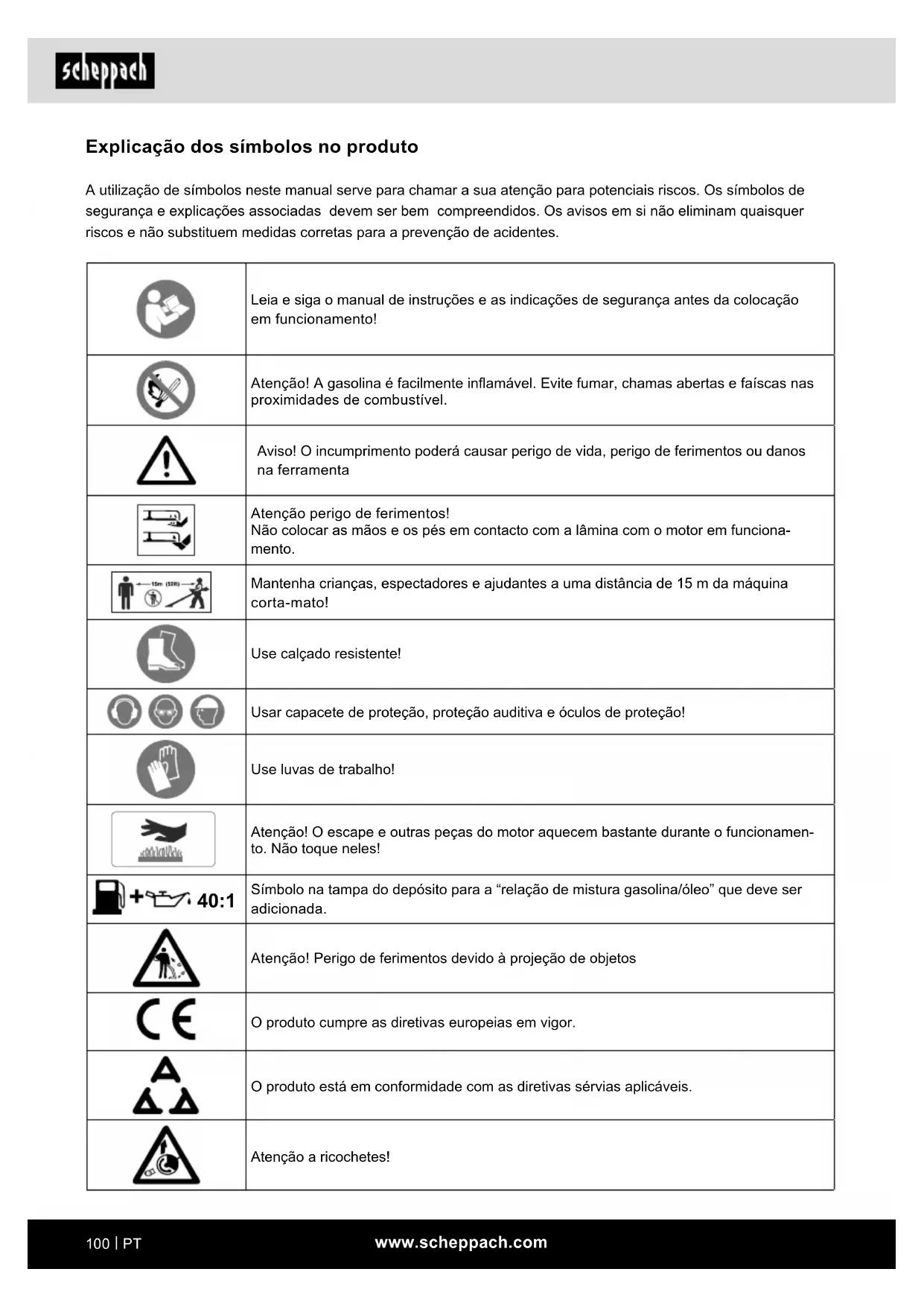 Explicação dos símbolos no produto A utilização de símbolos neste manual serve para chamar a sua atenção para potenciais riscos. Os símbolos de segurança e explicações associadas devem ser bem compreendidos. Os avisos em si não eliminam quaisquer riscos e não substituem medidas corretas para a prevenção de acidentes. Leia e siga o manual de instruções e as indicações de segurança antes da colocação em funcionamento! Atenção! A gasolina é facilmente inamável. Evite fumar, chamas abertas e faíscas nas proximidades de combustível. Aviso! O incumprimento poderá causar perigo de vida, perigo de ferimentos ou danos na ferramenta Atenção perigo de ferimentos! Não colocar as mãos e os pés em contacto com a lâmina com o motor em funciona- mento. Mantenha crianças, espectadores e ajudantes a uma distância de 15 m da máquina corta-mato! Use calçado resistente! Usar capacete de proteção, proteção auditiva e óculos de proteção! Use luvas de trabalho! Atenção! O escape e outras peças do motor aquecem bastante durante o funcionamen- to. Não toque neles! 40:1 Símbolo na tampa do depósito para a “relação de mistura gasolina/óleo” que deve ser adicionada. Atenção! Perigo de ferimentos devido à projeção de objetos O produto cumpre as diretivas europeias em vigor. O produto está em conformidade com as diretivas sérvias aplicáveis. Atenção a ricochetes!www.scheppach.com