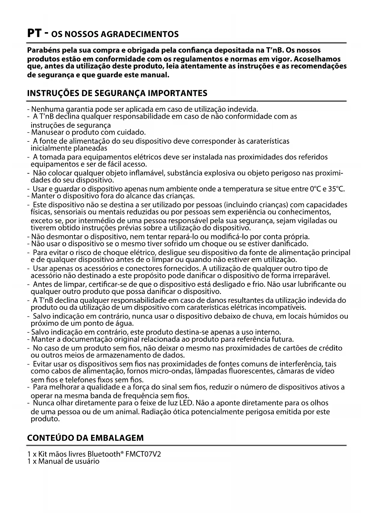 Formato de música MP3/WMA Pen drive USB (Máx) 64GBUsar a função Bluetooth® a) Ative a função Bluetooth® do seu dispositivo e emparelhe com «FMCT07» (alguns dispositivos podem exigir um código PIN: 0000). b) Após o emparelhamento, a música do seu dispositivo será transmitida para o rádio do carro. c) No modo música, se houver uma chamada recebida, o transmissor mudará automaticamente para o modo de chamada. d) Pressione o botão (1) uma vez para atender e pressione novamente o botão (1) para desligar. e) Pressione o botão (1) duas vezes para rejeitar uma chamada recebida. f) Para rediscar o último número, pressione o botão (1) duas vezes. OPERAÇÃO PRECISA DE AJUDA? Preocupados com a satisfação dos nossos clientes, fornecemos a possibilidade de nos contactar através do email info@t-nb.com. Para obter informações sobre manutenção, reparações e outras informações sobre o produto, consulte o nosso Website: www.t-nb.com Corrente contínua Para identicar na placa sinalética que o dispositivo apenas pode ser alimen- tado em corrente contínua; para marcar os bornes correspondentes. Operação Transmissor FM Ligar/Desligar Conecte o transmissor FM na tomada do acendedor de cigarros do veículo. Seu FMCT07V2 ligará automa- ticamente. Reproduzir/Pausar Pressione o botão (1) uma vez no modo música. Atender/Desligar/Rejeitar/ Rediscar Pressione o botão (1) uma vez para atender uma chama- da, pressione novamente para desligar. Dê um duplo clique no botão (1) para rejeitar uma chamada. Quando não estiver em uma chamada, pressione duas vezes o botão (1) para rediscar sua última chamada. Ajustar volume Pressione e segure o botão (4) para aumentar o volume, pressione e segure o botão (7) para diminuir o volume. Mudar de música Pressione o botão (7) para reproduzir a música anterior, pressione o botão (4) para reproduzir a próxima. Mudar o efeito de graves Pressione o botão (9) para aumentar as frequências graves. Modo USB/Bluetooth Pressione e segure os botões (4) e (7) para alternar entre o modo USB e Bluetooth®.IT - I NOSTRI RINGRAZIMENTI Congratulazioni per l’acquisto, ti ringraziamo per la ducia che hai risposto in T’nB. I nostri prodotti sono conformi ai regolamenti e alle norme vigenti. Prima dell’utilizzo del prodotto, ti consigliamo di leggere attentamente le istruzioni e le istruzioni di sicurezza, e di conservare il presente manuale.