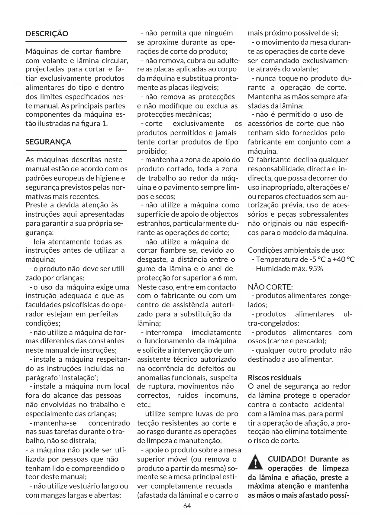 Fig. 164 DESCRIÇÃO Máquinas de cortar ambre com volante e lâmina circular, projectadas para cortar e fa- tiar exclusivamente produtos alimentares do tipo e dentro dos limites especicados nes- te manual. As principais partes componentes da máquina es- tão ilustradas na gura 1. SEGURANÇA As máquinas descritas neste manual estão de acordo com os padrões europeus de higiene e segurança previstos pelas nor- mativas mais recentes. Preste a devida atenção às instruções aqui apresentadas para garantir a sua própria se- gurança: - leia atentamente todas as instruções antes de utilizar a máquina; - o produto não deve ser utili- zado por crianças; - o uso da máquina exige uma instrução adequada e que as faculdades psicofísicas do ope- rador estejam em perfeitas condições; - não utilize a máquina de for- mas diferentes das constantes neste manual de instruções; - instale a máquina respeitan- do as instruções incluídas no parágrafo ‘Instalação’; - instale a máquina num local fora do alcance das pessoas não envolvidas no trabalho e especialmente das crianças; - mantenha-se concentrado nas suas tarefas durante o tra- balho, não se distraia; - a máquina não pode ser uti- lizada por pessoas que não tenham lido e compreendido o teor deste manual; - não utilize vestuário largo ou com mangas largas e abertas; - não permita que ninguém se aproxime durante as ope- rações de corte do produto; - não remova, cubra ou adulte- re as placas aplicadas ao corpo da máquina e substitua pronta- mente as placas ilegíveis; - não remova as protecções e não modique ou exclua as protecções mecânicas; - corte exclusivamente os produtos permitidos e jamais tente cortar produtos de tipo proibido; - mantenha a zona de apoio do produto cortado, toda a zona de trabalho ao redor da máq- uina e o pavimento sempre lim- pos e secos; - não utilize a máquina como superfície de apoio de objectos estranhos, particularmente du- rante as operações de corte; - não utilize a máquina de cortar ambre se, devido ao desgaste, a distância entre o gume da lâmina e o anel de protecção for superior a 6 mm. Neste caso, entre em contacto com o fabricante ou com um centro de assistência autori- zado para a substituição da lâmina; - interrompa imediatamente o funcionamento da máquina e solicite a intervenção de um assistente técnico autorizado na ocorrência de defeitos ou anomalias funcionais, suspeita de ruptura, movimentos não correctos, ruídos incomuns, etc.; - utilize sempre luvas de pro- tecção resistentes ao corte e ao rasgo durante as operações de limpeza e manutenção; - apoie o produto sobre a mesa superior móvel (ou remova o produto a partir da mesma) so- mente se a mesa principal esti- ver completamente recuada (afastada da lâmina) e o carro o mais próximo possível de si; - o movimento da mesa duran- te as operações de corte deve ser comandado exclusivamen- te através do volante; - nunca toque no produto du- rante a operação de corte. Mantenha as mãos sempre afa- stadas da lâmina; - não é permitido o uso de acessórios de corte que não tenham sido fornecidos pelo fabricante em conjunto com a máquina. O fabricante declina qualquer responsabilidade, directa e in- directa, que possa decorrer do uso inapropriado, alterações e/ ou reparos efectuados sem au- torização prévia, uso de aces- sórios e peças sobressalentes não originais ou não especí- cos para o modelo da máquina. Condições ambientais de uso: - Temperatura de -5 °C a +40 °C - Humidade máx. 95% NÃO CORTE: - produtos alimentares conge- lados; - produtos alimentares ul- tra-congelados; - produtos alimentares com ossos (carne e pescado); - qualquer outro produto não destinado a uso alimentar. Riscos residuais O anel de segurança ao redor da lâmina protege o operador contra o contacto acidental com a lâmina mas, para permi- tir a operação de aação, a pro- tecção não elimina totalmente o risco de corte. CUIDADO! Durante as operações de limpeza da lâmina e aação, preste a máxima atenção e mantenha as mãos o mais afastado possí- !65 vel da zona não protegida. Re- comenda-se vivamente o uso de luvas de protecção. INSTALAÇÃO Se a coluna de suporte (opcio- nal) não for utilizada, instale a máquina sobre uma superfície bem nivelada, seca e adequa- damente dimensionada para suportar o peso da máquina e do produto a cortar. Veri- que a presença de eventuais obstáculos ao movimento do volante e do carro e certi- que-se de que a operação de carregamento do produto possa ser feita sem impedi- mentos. A altura recomendada da superfície de trabalho é de aproximadamente 80 cm. Le- vante a máquina atentamente e insira os pés de borracha nos respectivos alojamentos junto à base. Em alguns modelos, os pés de apoio anteriores podem ser regulados e colocados na posição desejada em função da profundidade total da super- fície de trabalho. Para prevenir danos durante a operação de transporte, alguns modelos são fornecidos com o volante separado, não mon- tado. Se o volante da máquina não estiver montado, siga os passos abaixo: - insira o volante no eixo veri- cando a correcta posição dos furos presentes na manga/gru- po volante-eixo (Fig. 3-A); - insira o pino cónico na manga com a extremidade afunilada (diâmetro inferior) direccionada para a própria manga (Fig. 3-B); CUIDADO! Se o pino estiver posicionado cor- rectamente, será possível inse- ri-lo quase por completo sem forçar. - Empurre e encaixe o pino completamente. OPERAÇÃO - Assegure-se de que a lâmina esteja bem protegida: utilizan- do a alavanca de bloqueio da protecção da lâmina, se houver (Fig. 4); certicando-se de que o manípulo de ajuste da espes- sura esteja na posição de segu- rança (posição “0”) (13); - se o manípulo estiver direc- cionado para o volante levan- te-o para a posição de trabalho, em perpendicular em relação ao próprio volante; - ac