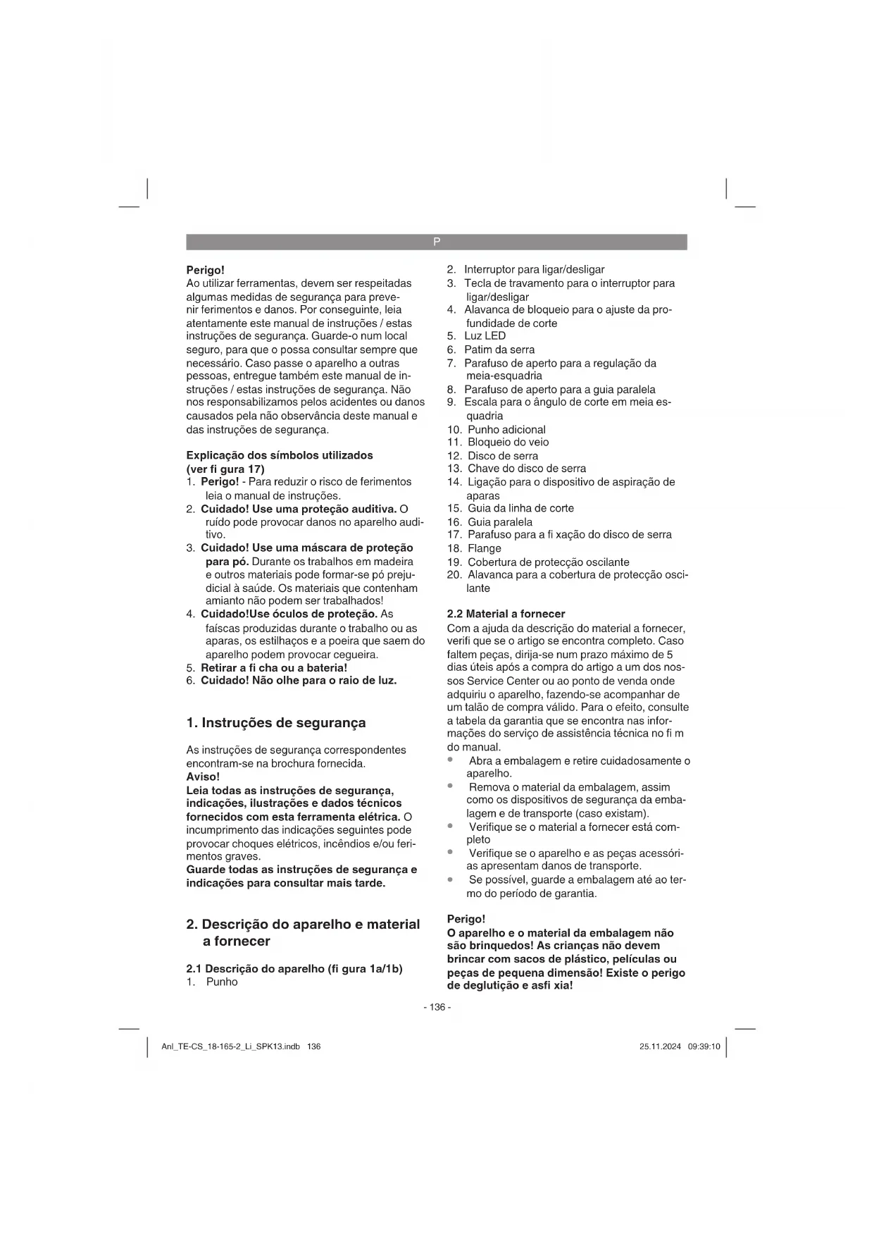 Se possível, guarde a embalagem até ao ter- mo do período de garantia. Perigo! O aparelho e o material da embalagem não são brinquedos! As crianças não devem brincar com sacos de plástico, películas ou peças de pequena dimensão! Existe o perigo de deglutição e asfi xia! Anl_TE-CS_18-165-2_Li_SPK13.indb 136Anl_TE-CS_18-165-2_Li_SPK13.indb 136 25.11.2024 09:39:1025.11.2024 09:39:10P