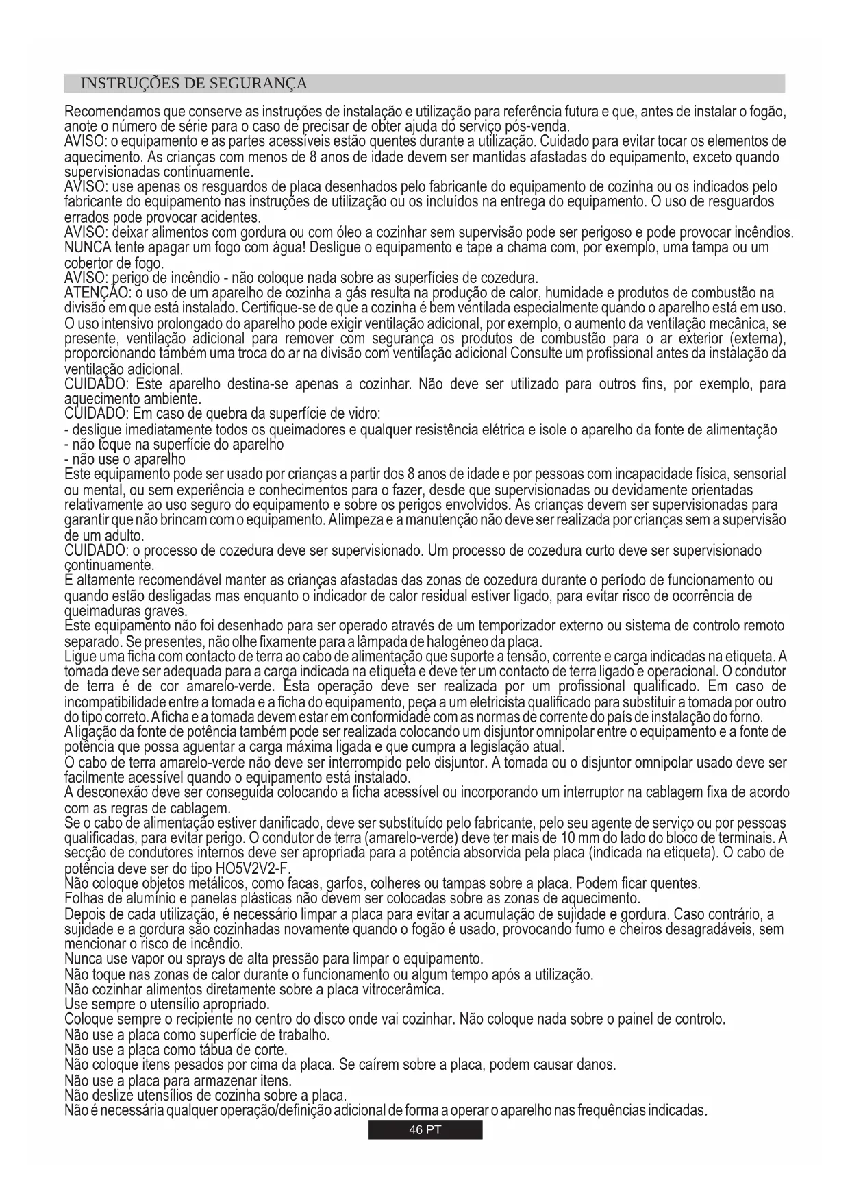 Ove possibile, coprire la padella con un coperchio. Regolare la fiamma in modo che non si sovrapponga al diametro della padella. L'apparecchio è conforme alla Direttiva Europea 2009/142/CE (GAD) e dal 21/04/2018, al Regolamento Apparecchi a Gas 2016/426 (GAR).46 PT Recomendamos que conserve as instruções de instalação e utilização para referência futura e que, antes de instalar o fogão, anote o número de série para o caso de precisar de obter ajuda do serviço pós-venda. AVISO: o equipamento e as partes acessíveis estão quentes durante a utilização. Cuidado para evitar tocar os elementos de aquecimento. As crianças com menos de 8 anos de idade devem ser mantidas afastadas do equipamento, exceto quando supervisionadas continuamente. AVISO: use apenas os resguardos de placa desenhados pelo fabricante do equipamento de cozinha ou os indicados pelo fabricante do equipamento nas instruções de utilização ou os incluídos na entrega do equipamento. O uso de resguardos errados pode provocar acidentes. AVISO: deixar alimentos com gordura ou com óleo a cozinhar sem supervisão pode ser perigoso e pode provocar incêndios. NUNCA tente apagar um fogo com água! Desligue o equipamento e tape a chama com, por exemplo, uma tampa ou um cobertor de fogo. AVISO: perigo de incêndio - não coloque nada sobre as superfícies de cozedura. ATENÇÃO: o uso de um aparelho de cozinha a gás resulta na produção de calor, humidade e produtos de combustão na divisão em que está instalado. Certifique-se de que a cozinha é bem ventilada especialmente quando o aparelho está em uso. O uso intensivo prolongado do aparelho pode exigir ventilação adicional, por exemplo, o aumento da ventilação mecânica, se presente, ventilação adicional para remover com segurança os produtos de combustão para o ar exterior (externa), proporcionando também uma troca do ar na divisão com ventilação adicional Consulte um profissional antes da instalação da ventilação adicional. CUIDADO: Este aparelho destina-se apenas a cozinhar. Não deve ser utilizado para outros fins, por exemplo, para aquecimento ambiente. CUIDADO: Em caso de quebra da superfície de vidro: - desligue imediatamente todos os queimadores e qualquer resistência elétrica e isole o aparelho da fonte de alimentação - não toque na superfície do aparelho - não use o aparelho Este equipamento pode ser usado por crianças a partir dos 8 anos de idade e por pessoas com incapacidade física, sensorial ou mental, ou sem experiência e conhecimentos para o fazer, desde que supervisionadas ou devidamente orientadas relativamente ao uso seguro do equipamento e sobre os perigos envolvidos. As crianças devem ser supervisionadas para garantir que não brincam com o equipamento. A limpeza e a manutenção não deve ser realizada por crianças sem a supervisão de um adulto. CUIDADO: o processo de cozedura deve ser supervisionado. Um processo de cozedura curto deve ser supervisionado continuamente. É altamente recomendável manter as crianças afastadas das zonas de cozedura durante o período de funcionamento ou quando estão desligadas mas enquanto o indicador de calor residual estiver ligado, para evitar risco de ocorrência de queimaduras graves. Este equipamento não foi desenhado para ser operado através de um temporizador externo ou sistema de controlo remoto separado. Se presentes, não olhe fixamente para a lâmpada de halogéneo da placa. Ligue uma ficha com contacto de terra ao cabo de alimentação que suporte a tensão, corrente e carga indicadas na etiqueta. A tomada deve ser adequada para a carga indicada na etiqueta e deve ter um contacto de terra ligado e operacional. O condutor de terra é de cor amarelo-verde. Esta operação deve ser realizada por um profissional qualificado. Em caso de incompatibilidade entre a tomada e a ficha do equipamento, peça a um eletricista qualificado para substituir a tomada por outro do tipo correto. A ficha e a tomada devem estar em conformidade com as normas de corrente do país de instalação do forno. A ligação da fonte de potência também pode ser realizada colocando um disjuntor omnipolar entre o equipamento e a fonte de potência que possa aguentar a carga máxima ligada e que cumpra a legislação atual. O cabo de terra amarelo-verde não deve ser interrompido pelo disjuntor. A tomada ou o disjuntor omnipolar usado deve ser facilmente acessível quando o equipamento está instalado. A desconexão deve ser conseguida colocando a ficha acessível ou incorporando um interruptor na cablagem fixa de acordo com as regras de cablagem. Se o cabo de alimentação estiver danificado, deve ser substituído pelo fabricante, pelo seu agente de serviço ou por pessoas qualificadas, para evitar perigo. O condutor de terra (amarelo-verde) deve ter mais de 10 mm do lado do bloco de terminais. A secção de condutores internos deve ser apropriada para a potência absorvida pela placa (indicada na etiqueta). O cabo de potência deve ser do tipo HO5V2V2-F. Não coloque objetos metálicos, como facas, garfos, colheres ou tampas sobre a placa. Podem ficar quentes. Folhas de alumínio e panelas plásticas não devem ser colocadas sobre as zonas de aquecimento. Depois de cada utilização, é necessário limpar a placa para evitar a acumulação de sujidade e gordura. Caso contrário, a sujidade e a gordura são cozinhadas novamente quando o fogão é usado, provocando fumo e cheiros desagradáveis, sem mencionar o risco de incêndio. Nunca use vapor ou sprays de alta pressão para limpar o equipamento. Não toque nas zonas de calor durante o funcionamento ou algum tempo após a utilização. Não cozinhar alimentos diretamente sobre a placa vitrocerâmica. Use sempre o utensílio apropriado. Coloque sempre o recipiente no centro do disco onde vai cozinhar. Não coloque nada sobre o painel de controlo. Não use a placa como superfície de trabalho. Não use a placa como tábua de corte. Não coloqu
