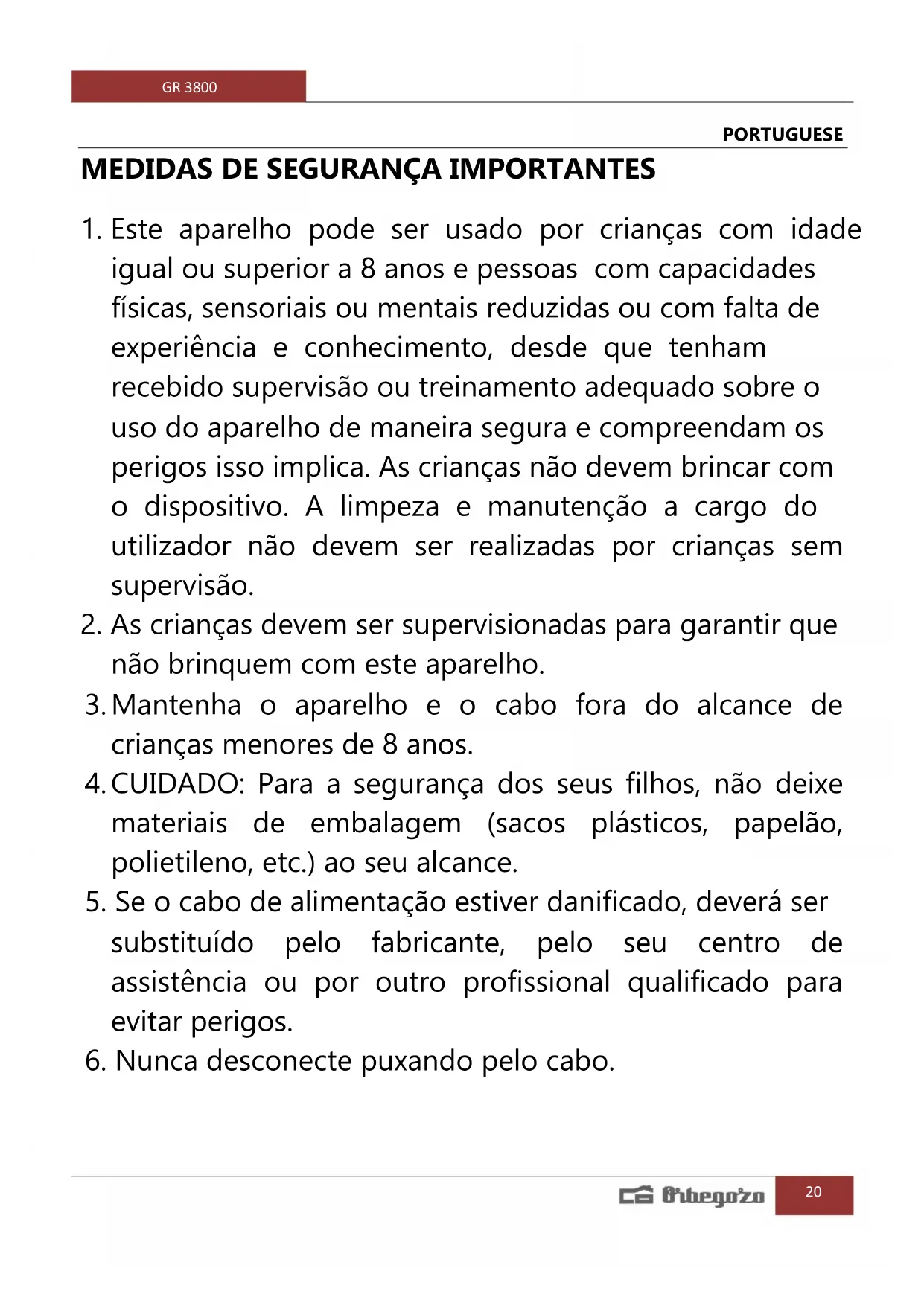6. Nunca desconecte puxando pelo cabo.GR 3800