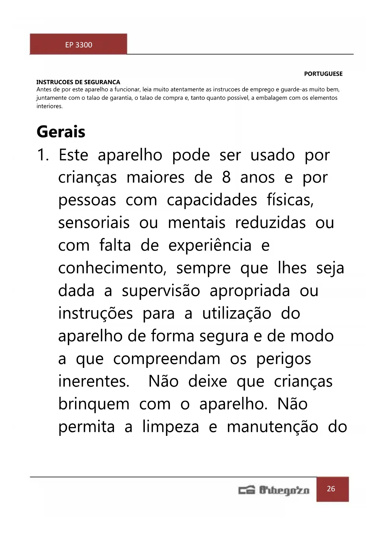 Desligar o aparelho e retirá-lo da alimentação em caso de não vigilância e antes de mudar os acessórios ou peças próximas que se movam durante a utilização, antes da montagem, da desmontagem ou da limpeza. Este aparelho pode ser utilizado por crianças a partir dos 8 anos, desde que o façam sob supervisão ou tenham recebido formação sobre a utilização segura do aparelho e compreendam os perigos que este comporta. As crianças não devem realizar operações de limpeza ou manutenção do aparelho, a menos que sejam maiores de 8 anos e se encontrem sob aEP 3300