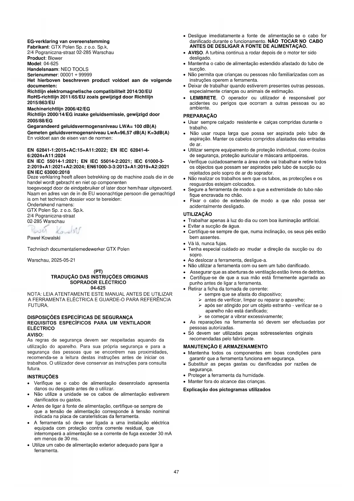Os produtos eléctricos não devem ser eliminados juntamente com o lixo doméstico, mas devem ser levados para instalações adequadas para eliminação. Contacte o revendedor do produto ou as autoridades locais para obter informações sobre a eliminação. Os resíduos de equipamentos eléctricos e electrónicos contêm substâncias que não são amigas do ambiente. O equipamento não reciclado representa um risco potencial para o ambiente e para a saúde humana. "GTX Poland Spółka z ograniczoną odpowiedzialnością" Spółka komandytowa, , com sede social em Varsóvia, ul. Pograniczna 2/4 (doravante: "GTX Polónia") informa que todos os direitos de autor sobre o conteúdo deste manual (doravante: "Manual"), incluindo, entre outros. Todos os direitos de autor do conteúdo deste manual (a seguir designado por "Manual"), incluindo, entre outros, o seu texto, fotografias, diagramas, desenhos, bem como a sua composição, pertencem exclusivamente à GTX Poland e estão sujeitos a proteção legal nos termos da Lei de 4 de fevereiro de 1994 sobre direitos de autor e direitos conexos (ou seja, Jornal Oficial de 2006 n.º 90, ponto 631, conforme alterado). A cópia, processamento, publicação, modificação para fins comerciais de todo o Manual, bem como dos seus elementos individuais, sem o consentimento escrito da GTX Poland é estritamente proibida e pode resultar em responsabilidade civil e criminal. Declaração de Conformidade CE Fabricante: GTX Polónia Sp. z o.o. Sp.k, Rua Pograniczna, 2/4 02-285 Varsóvia Produto: Soprador Modelo: 04-625 Nome comercial: NEO TOOLS Número de série: 00001 ÷ 99999 O produto descrito acima está em conformidade com os seguintes documentos: Diretiva de Compatibilidade Electromagnética 2014/30/UE Diretiva RoHS 2011/65/UE, com a redação que lhe foi dada pela Diretiva 2015/863/UE Diretiva Máquinas 2006/42/CE Diretiva 2000/14/CE relativa às emissões sonoras, com a redação que lhe foi dada pela Diretiva 2005/88/CE Nível de potência sonora garantida LWA= 100 dB(A) Nível de potência sonora medido LwA=96,57 dB(A) K=3dB(A) E cumpre os requisitos das normas: EN 62841-1:2015+AC:15+A11:2022; EN IEC 62841-4- 6:2024+A11:2024 EN IEC 55014-1:2021; EN IEC 55014-2:2021; IEC 61000-3- 2:2019+A1:2021+A2:2024; EN61000-3-3:2013+A1:2019+A2:2021 EN IEC 63000:2018 Esta declaração refere-se apenas à máquina tal como colocada no mercado e não inclui os componentes adicionadas pelo utilizador final ou por ele realizadas posteriormente. Nome e endereço da pessoa residente na UE autorizada a preparar o dossier técnico: Assinado em nome de: GTX Polónia Sp. z o.o. Sp.k. Rua Pograniczna, 2/4 02-285 Varsóvia Paweł Kowalski Responsável pela documentação técnica GTX Polónia Varsóvia, 2025-05-21 (ES)