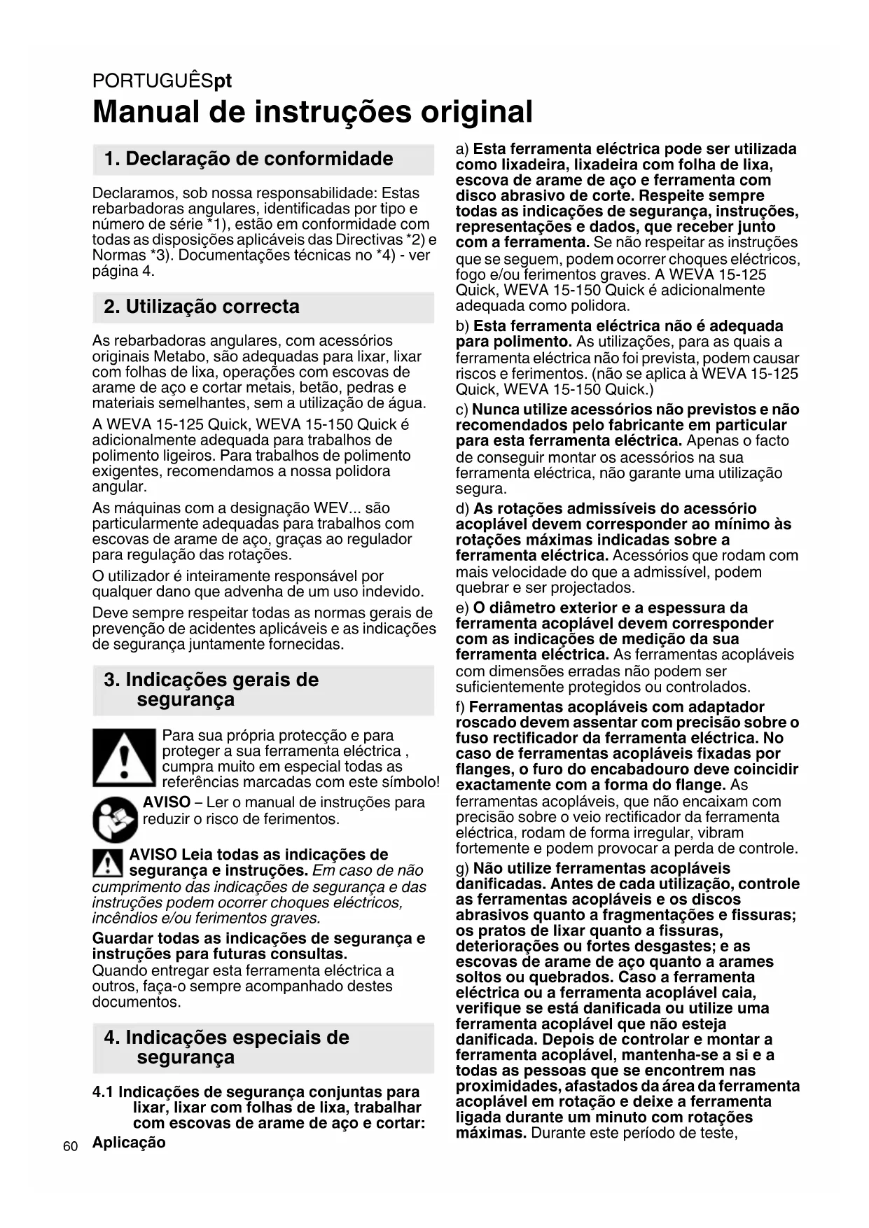 Manual de instruções original Declaramos, sob nossa responsabilidade: Estas rebarbadoras angulares, identificadas por tipo e número de série *1), estão em conformidade com todas as disposições aplicáveis das Directivas *2) e Normas *3). Documentações técnicas no *4) - ver página 4. As rebarbadoras angulares, com acessórios originais Metabo, são adequadas para lixar, lixar com folhas de lixa, operações com escovas de arame de aço e cortar metais, betão, pedras e materiais semelhantes, sem a utilização de água. A WEVA 15-125 Quick, WEVA 15-150 Quick é adicionalmente adequada para trabalhos de polimento ligeiros. Para trabalhos de polimento exigentes, recomendamos a nossa polidora angular. As máquinas com a designação WEV... são particularmente adequadas para trabalhos com escovas de arame de aço, graças ao regulador para regulação das rotações. O utilizador é inteiramente responsável por qualquer dano que advenha de um uso indevido. Deve sempre respeitar todas as normas gerais de prevenção de acidentes aplicáveis e as indicações de segurança juntamente fornecidas. Para sua própria protecção e para proteger a sua ferramenta eléctrica , cumpra muito em especial todas as referências marcadas com este símbolo! AVISO – Ler o manual de instruções para reduzir o risco de ferimentos. AVISO Leia todas as indicações de segurança e instruções. Em caso de não cumprimento das indicações de segurança e das instruções podem ocorrer choques eléctricos, incêndios e/ou ferimentos graves. Guardar todas as indicações de segurança e instruções para futuras consultas. Quando entregar esta ferramenta eléctrica a outros, faça-o sempre acompanhado destes documentos.