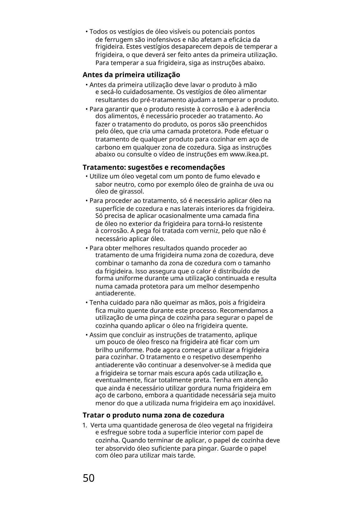 - Para garantir que o produto resiste à corrosão e à aderência dos alimentos, é necessário proceder ao tratamento. Ao fazer o tratamento do produto, os poros são preenchidos pelo óleo, que cria uma camada protetora. Pode efetuar o tratamento de qualquer produto para cozinhar em aço de carbono em qualquer zona de cozedura. Siga as instruções abaixo ou consulte o vídeo de instruções em www.ikea.pt. Tratamento: sugestões e recomendações