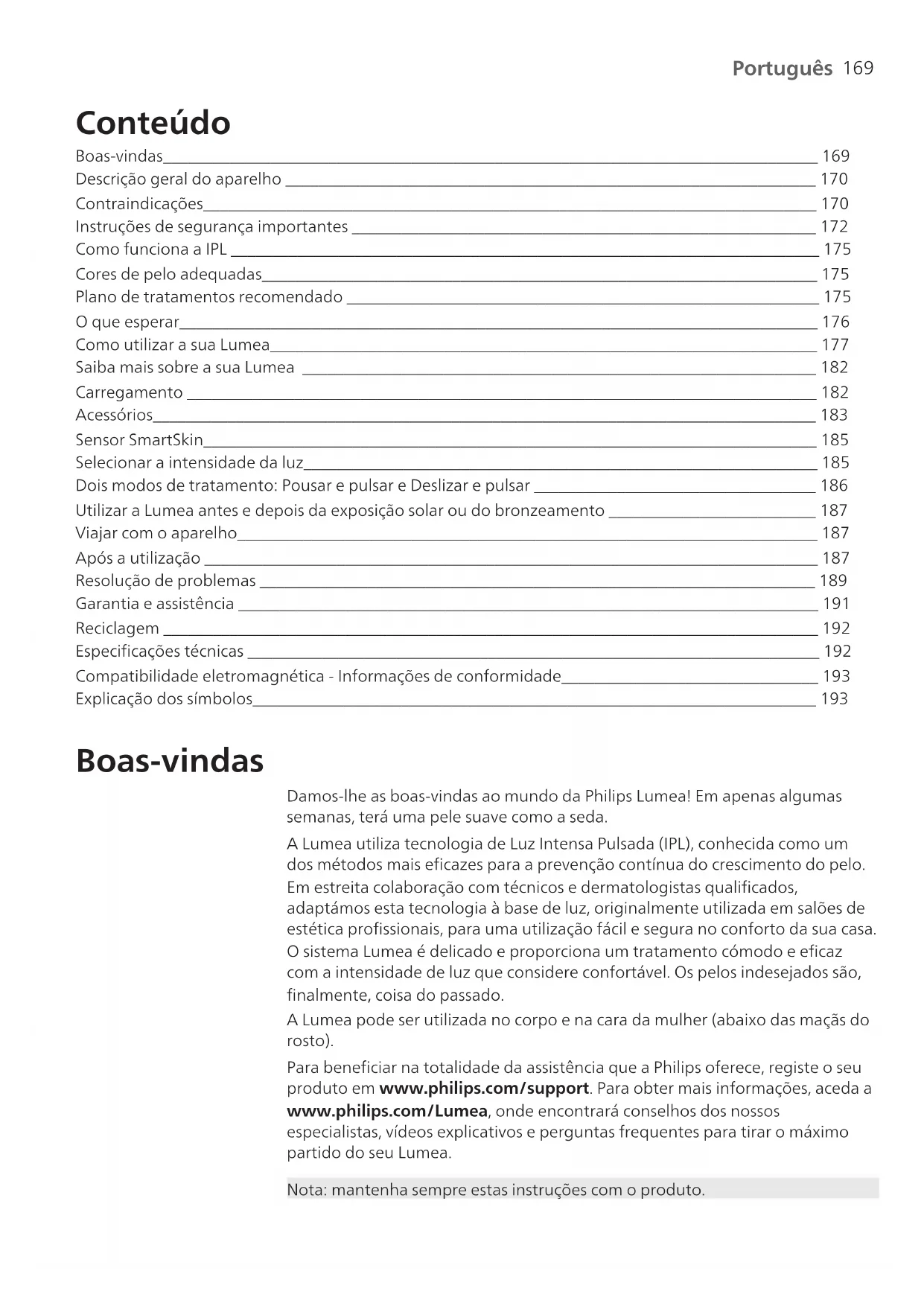 Português Conteúdo Boas-vindas_______________________________________________________________________________ 169 Descrição geral do aparelho ________________________________________________________________ 170 Contraindicações__________________________________________________________________________ 170 Instruções de segurança importantes ________________________________________________________ 172 Como funciona a IPL _______________________________________________________________________ 175 Cores de pelo adequadas___________________________________________________________________ 175 Plano de tratamentos recomendado _________________________________________________________ 175 O que esperar_____________________________________________________________________________ 176 Como utilizar a sua Lumea__________________________________________________________________ 177 Saiba mais sobre a sua Lumea ______________________________________________________________ 182 Carregamento ____________________________________________________________________________ 182 Acessórios________________________________________________________________________________ 183 Sensor SmartSkin__________________________________________________________________________ 185 Selecionar a intensidade da luz______________________________________________________________ 185 Dois modos de tratamento: Pousar e pulsar e Deslizar e pulsar __________________________________ 186 Utilizar a Lumea antes e depois da exposição solar ou do bronzeamento _________________________ 187 Viajar com o aparelho______________________________________________________________________ 187 Após a utilização __________________________________________________________________________ 187 Resolução de problemas ___________________________________________________________________ 189 Garantia e assistência ______________________________________________________________________ 191 Reciclagem _______________________________________________________________________________ 192 Especificações técnicas _____________________________________________________________________ 192 Compatibilidade eletromagnética - Informações de conformidade_______________________________ 193 Explicação dos símbolos____________________________________________________________________ 193 Boas-vindas Damos-lhe as boas-vindas ao mundo da Philips Lumea! Em apenas algumas semanas, terá uma pele suave como a seda. A Lumea utiliza tecnologia de Luz Intensa Pulsada (IPL), conhecida como um dos métodos mais eficazes para a prevenção contínua do crescimento do pelo. Em estreita colaboração com técnicos e dermatologistas qualificados, adaptámos esta tecnologia à base de luz, originalmente utilizada em salões de estética profissionais, para uma utilização fácil e segura no conforto da sua casa. O sistema Lumea é delicado e proporciona um tratamento cómodo e eficaz com a intensidade de luz que considere confortável. Os pelos indesejados são, finalmente, coisa do passado. A Lumea pode ser utilizada no corpo e na cara da mulher (abaixo das maçãs do rosto). Para beneficiar na totalidade da assistência que a Philips oferece, registe o seu produto em www.philips.com/support. Para obter mais informações, aceda a www.philips.com/Lumea, onde encontrará conselhos dos nossos especialistas, vídeos explicativos e perguntas frequentes para tirar o máximo partido do seu Lumea. Nota: mantenha sempre estas instruções com o produto.170 Português Descrição geral do aparelho 1 Janela de saída da luz (com filtro UV integrado) 2 Acessórios a Acessório corporal b Acessório para o rosto c Acessório para linha do biquíni (BRI951, BRI957, BRI958, BRI976, BRI977) d Acessório para as axilas (BRI951, BRI957, BRI958, BRI976, BRI977) e Acessório de precisão (BRI953, BRI955, BRI973) 3 Sensor SmartSkin 4 Sistema de segurança integrado 5 Reflector no interior do acessório 6 Contactos electrónicos 7 Abertura para contactos electrónicos 8 Botão de luz pulsada 9 Botão ligar/desligar 10 Botão de confirmação 11 Botões de alternar 12 Luzes de intensidade 13 Botão SmartSkin 14 Luz de carga 15 Luz "PRONTO para pulsar" 16 Aberturas de entrada para ventilação da ventoinha 17 Aberturas de saída para ventilação 18 Tomada do aparelho 19 Adaptador 20 Ficha pequena 21 Pano de limpeza (não ilustrado) 22 Bolsa (não ilustrado) Contraindicações Condições Nunca utilize o aparelho: