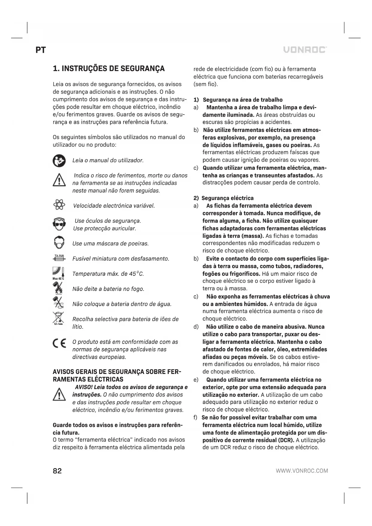 Antes de efectuar a limpeza e a manuten- ção, desligue sempre a máquina e retire a bateria da máquina. Limpe a caixa da máquina com regularidade com um pano macio, de preferência após cada utili- zação. Certifique-se de que as aberturas de ventila- ção não têm pó ou sujidade. Retire a sujidade muito persistente com um pano macio humedecido com água de sabão. Não utilize solventes, como gasolina, álcool, amoníaco, etc. Este tipo de produ- tos químicos danificam os componentes sintéticos. AMBIENTE Os equipamentos eléctricos ou electrónicos defeituosos e/ou eliminados devem ser recolhidos em locais de reciclagem adequados. Apenas para os países da CE Não elimine as ferramentas eléctricas em conjunto com os resíduos domésticos. De acordo com a directiva europeia 2012/19/CE sobre resíduos de equipamentos eléctricos e electrónicos e a res- pectiva implementação na legislação nacional, as ferramentas eléctricas que já não sejam utilizadas devem ser recolhidas em separado e eliminadas de maneira ecológica. GARANTIA Os produtos da VONROC são desenvolvidos de acordo com os padrões de qualidade mais ele- vados e não apresentam quaisquer defeitos em termos de materiais e mão-de-obra em relação ao período estipulado por lei, cujo início é a partir da data de compra original. Se o produto apresen- tar qualquer falha durante este período devido a qualquer defeito no material e/ou de mão-de-obra, contacte a VONROC directamente. As seguintes circunstâncias estão excluídas desta garantia: