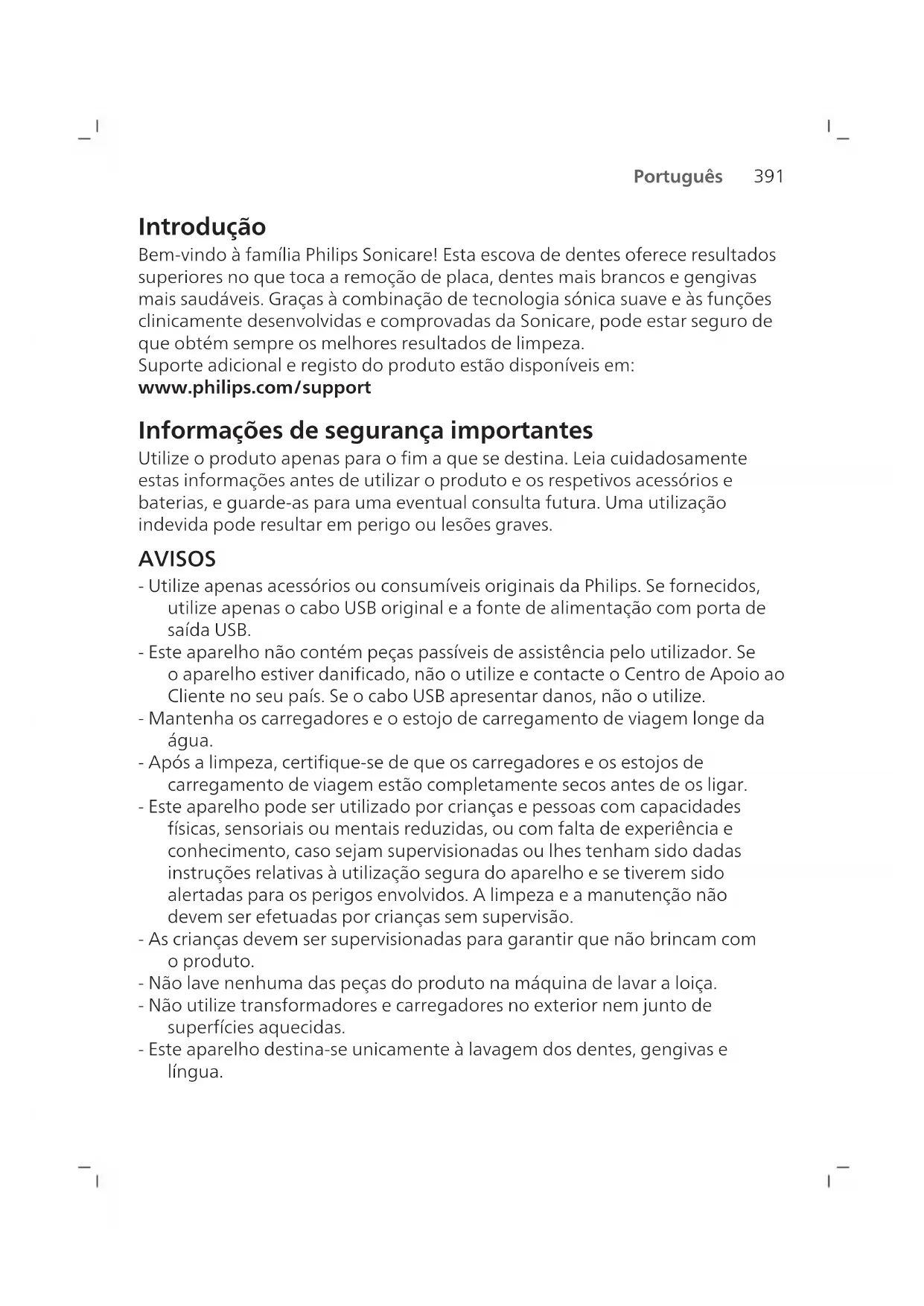 Português Introdução Bem-vindo à família Philips Sonicare! Esta escova de dentes oferece resultados superiores no que toca a remoção de placa, dentes mais brancos e gengivas mais saudáveis. Graças à combinação de tecnologia sónica suave e às funções clinicamente desenvolvidas e comprovadas da Sonicare, pode estar seguro de que obtém sempre os melhores resultados de limpeza. Suporte adicional e registo do produto estão disponíveis em: www.philips.com/support Informações de segurança importantes Utilize o produto apenas para o fim a que se destina. Leia cuidadosamente estas informações antes de utilizar o produto e os respetivos acessórios e baterias, e guarde-as para uma eventual consulta futura. Uma utilização indevida pode resultar em perigo ou lesões graves. AVISOS - Utilize apenas acessórios ou consumíveis originais da Philips. Se fornecidos, utilize apenas o cabo USB original e a fonte de alimentação com porta de saída USB. - Este aparelho não contém peças passíveis de assistência pelo utilizador. Se o aparelho estiver danificado, não o utilize e contacte o Centro de Apoio ao Cliente no seu país. Se o cabo USB apresentar danos, não o utilize. - Mantenha os carregadores e o estojo de carregamento de viagem longe da água. - Após a limpeza, certifique-se de que os carregadores e os estojos de carregamento de viagem estão completamente secos antes de os ligar. - Este aparelho pode ser utilizado por crianças e pessoas com capacidades físicas, sensoriais ou mentais reduzidas, ou com falta de experiência e conhecimento, caso sejam supervisionadas ou lhes tenham sido dadas instruções relativas à utilização segura do aparelho e se tiverem sido alertadas para os perigos envolvidos. A limpeza e a manutenção não devem ser efetuadas por crianças sem supervisão. - As crianças devem ser supervisionadas para garantir que não brincam com o produto. - Não lave nenhuma das peças do produto na máquina de lavar a loiça. - Não utilize transformadores e carregadores no exterior nem junto de superfícies aquecidas. - Este aparelho destina-se unicamente à lavagem dos dentes, gengivas e língua.392 Português - Interrompa a utilização da cabeça de escovagem se esta apresentar cerdas esmagadas ou dobradas. Substitua a cabeça de escovagem de 3 em 3 meses ou mais cedo no caso de aparecerem sinais de desgaste. - Evite o contacto direto com produtos que contenham óleos essenciais ou óleo de coco. Um contacto deste tipo pode resultar no deslocamento das cerdas. - A altitude máxima de utilização reside nos 4500 metros.