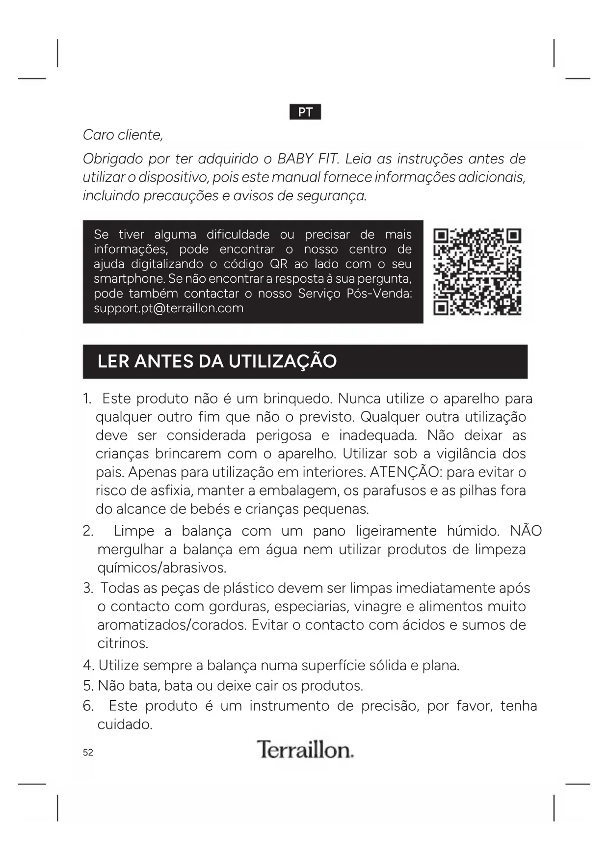 Caro cliente, Obrigado por ter adquirido o BABY FIT. Leia as instruções antes de utilizar o dispositivo, pois este manual fornece informações adicionais, incluindo precauções e avisos de segurança. Se tiver alguma dificuldade ou precisar de mais informações, pode encontrar o nosso centro de ajuda digitalizando o código QR ao lado com o seu smartphone Se não encontrar a resposta à sua pergunta, pode também contactar o nosso Serviço Pós-Venda: supportpt@terrailloncom
