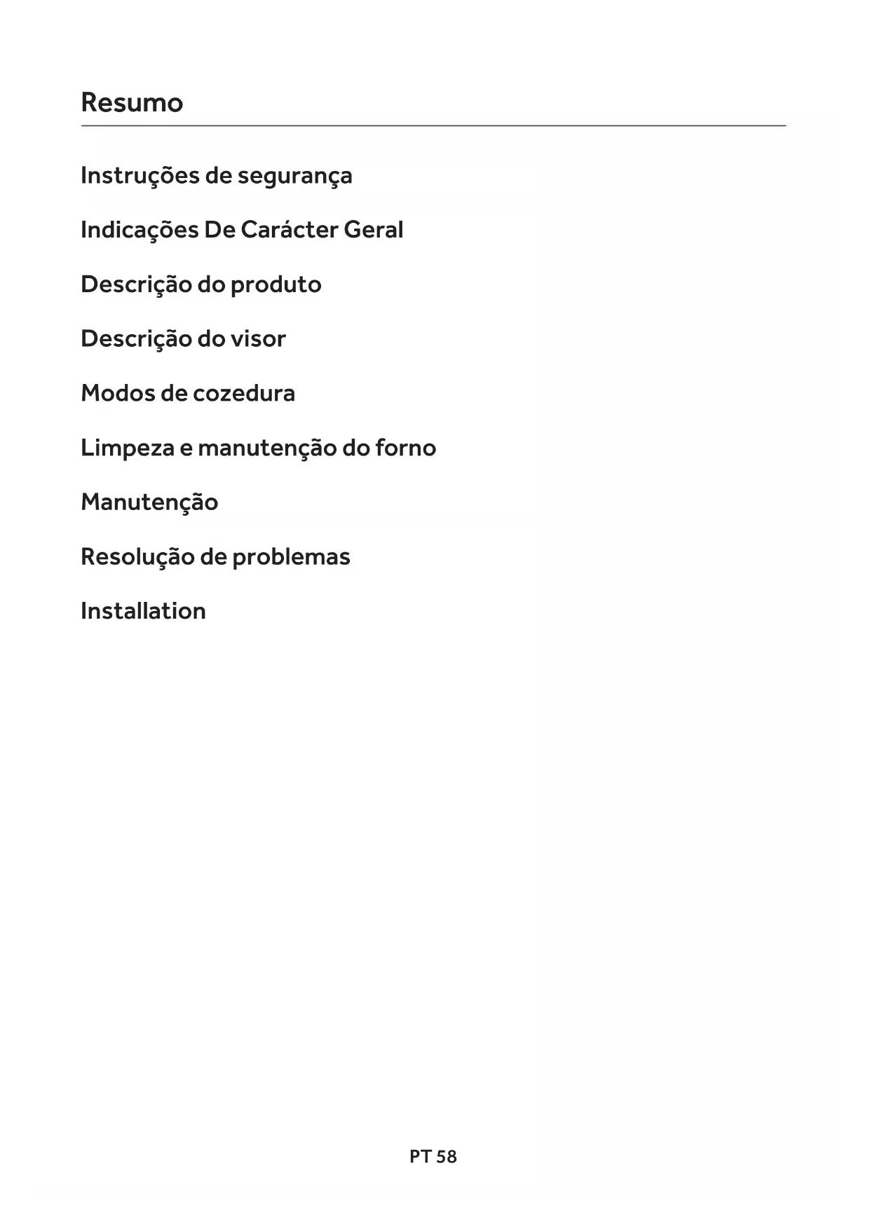 PT Se o móvel estiver equipado com uma co- bertura na parte posterior, faça uma abertura para a passagem do cabo de alimentação. PT Se o forno não estiver equipado com uma ventoinha de arrefecimento, faça uma abertu- ra 460 mm x 15 mm. PT O fabricante declina toda e qualquer responsabilidade por gralhas, erros tipográcos ou de transcrição/ tradução contidos neste manual. Reservamo-nos o direito de Introduzir alterações nos nossos produtos, conforme necessário, tendo Inclusive em atenção os Interesses relativos ao respectivo consumo, sem prejuízo das características associadas à segurança ou ao funcionamento dos electrodomésticos.ES 77 Indicaciones de seguridad Advertencias Generales Descripción del producto Descripción general Modalidades de cocción Limpieza y mantenimiento del horno Mantenimiento Solución de problemas Installation ÍndiceES 78