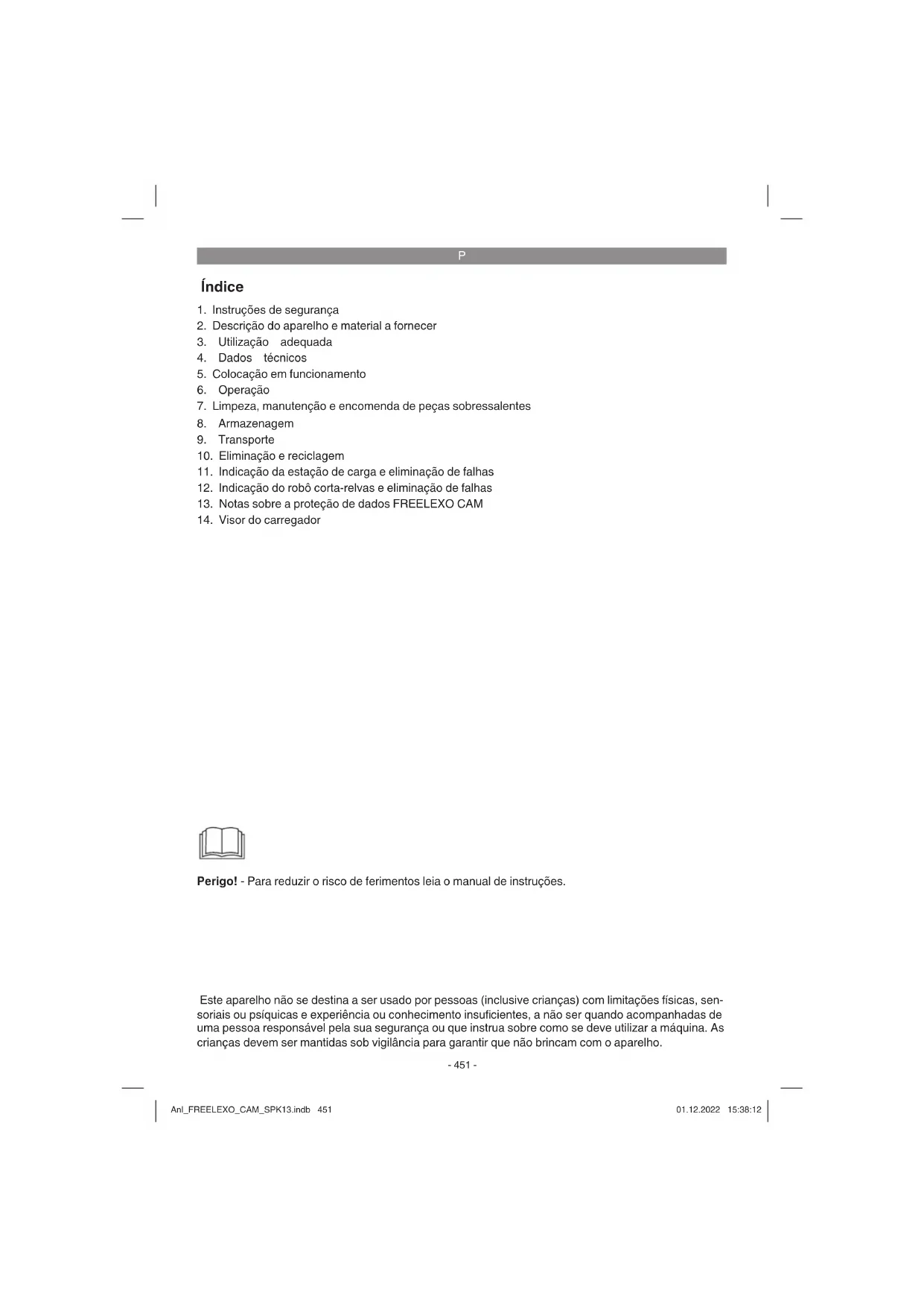 Perigo! - Para reduzir o risco de ferimentos leia o manual de instruções. Este aparelho não se destina a ser usado por pessoas (inclusive crianças) com limitações físicas, sen- soriais ou psíquicas e experiência ou conhecimento insufi cientes, a não ser quando acompanhadas de uma pessoa responsável pela sua segurança ou que instrua sobre como se deve utilizar a máquina. As crianças devem ser mantidas sob vigilância para garantir que não brincam com o aparelho. Anl_FREELEXO_CAM_SPK13.indb 451Anl_FREELEXO_CAM_SPK13.indb 451 01.12.2022 15:38:1201.12.2022 15:38:12P