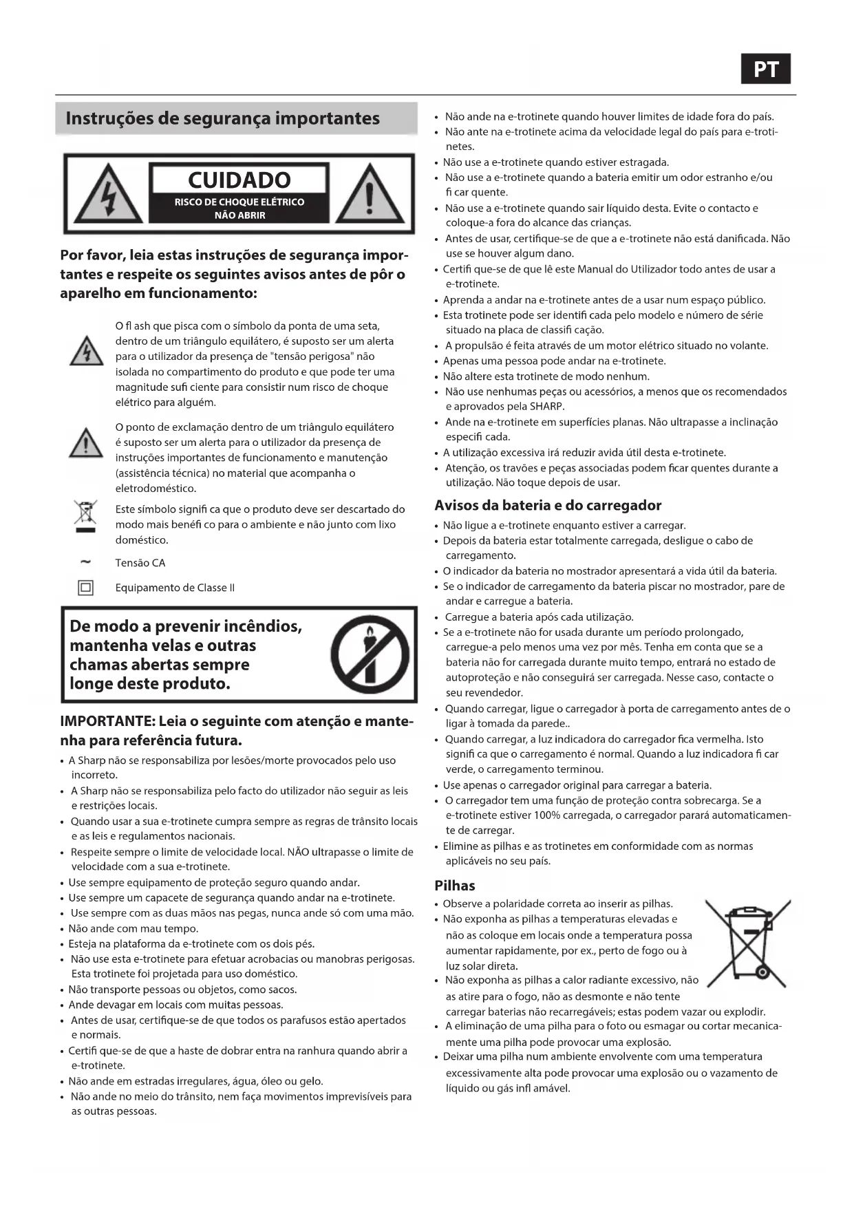 - Pelo presente, a Sharp Consumer Electronics Poland sp. z o.o. declara que esta e-trotinete encontra-se em conformidade com os requisitos essenciais e outras disposições relevantes da Diretiva RED 2014/53/EU, dos Regulamentos de Equipamento de Rádio 2017 do Reino Unido e PN-EN 17128: 2021-03