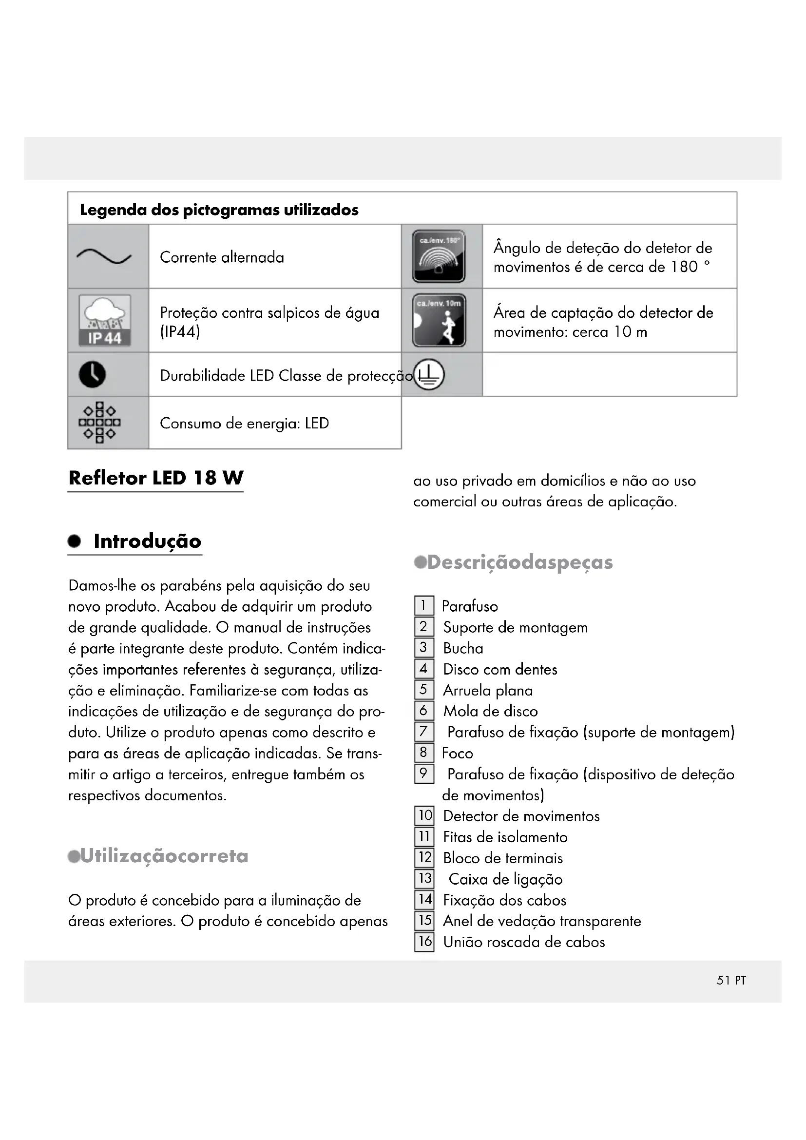Regulador rotativo LUX Dados técnicos Tensão de serviço: 230 V∼ 50 Hz Consumo de energia: 18 W Lâmpada: 30 x 0,5 W LED Interruptor solar: regulável de 10 lx –20.000 lx Período de iluminação: ajustável de cerca 10s +/- 5s – 4 min +/- 1min Ângulo de captação do dispositivo de deteção de movimentos: cerca 180° horizontal Alcance do dispositivo de deteção de movimentos: máximo 10 m Classe de protecção: I Grau de proteção: IP44 (proteção contra salpicos de água) Dimensões totais: 15,5 x 17,5 x 14,5 cm Peso: cerca 460 g (incl. acessórios) Ecrã de projeção: máx. 15,5 x 17,5 cm Altura de montagem: cerca 1,8–2,5 m Certificado pelo TÜV SÜD- / GS Material fornecido Após desembalar o aparelho, verifique sempre o material fornecido quanto à integridade, bem como o estado do produto. 1 Holofote LED com detetor de movimentos 2 Buchas (Ø 8 mm) 2 Parafusos (Ø 5 mm x 50 mm) 1 Suporte de montagem 1 Fixação dos cabos 2 Discos com dentes 2 Arruelas planas 2 Arruelas elásticas 2 Parafusos de fixação 1 Manual de instruções Indicações gerais de segurança