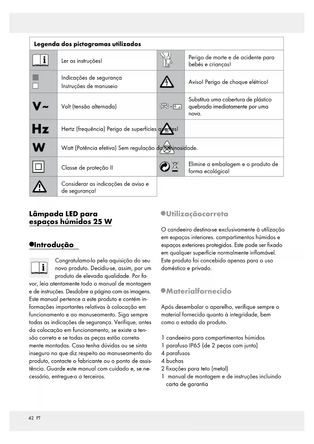 O candeeiro destino-se exclusivamente a utilização em espacços interiores. compartments humidos e espacços exteriores protegidos. Este pode ser fixado em qualquer superficie normalmente inflamável. Este produits foí concebido apenas para o uso dométrico e privado.