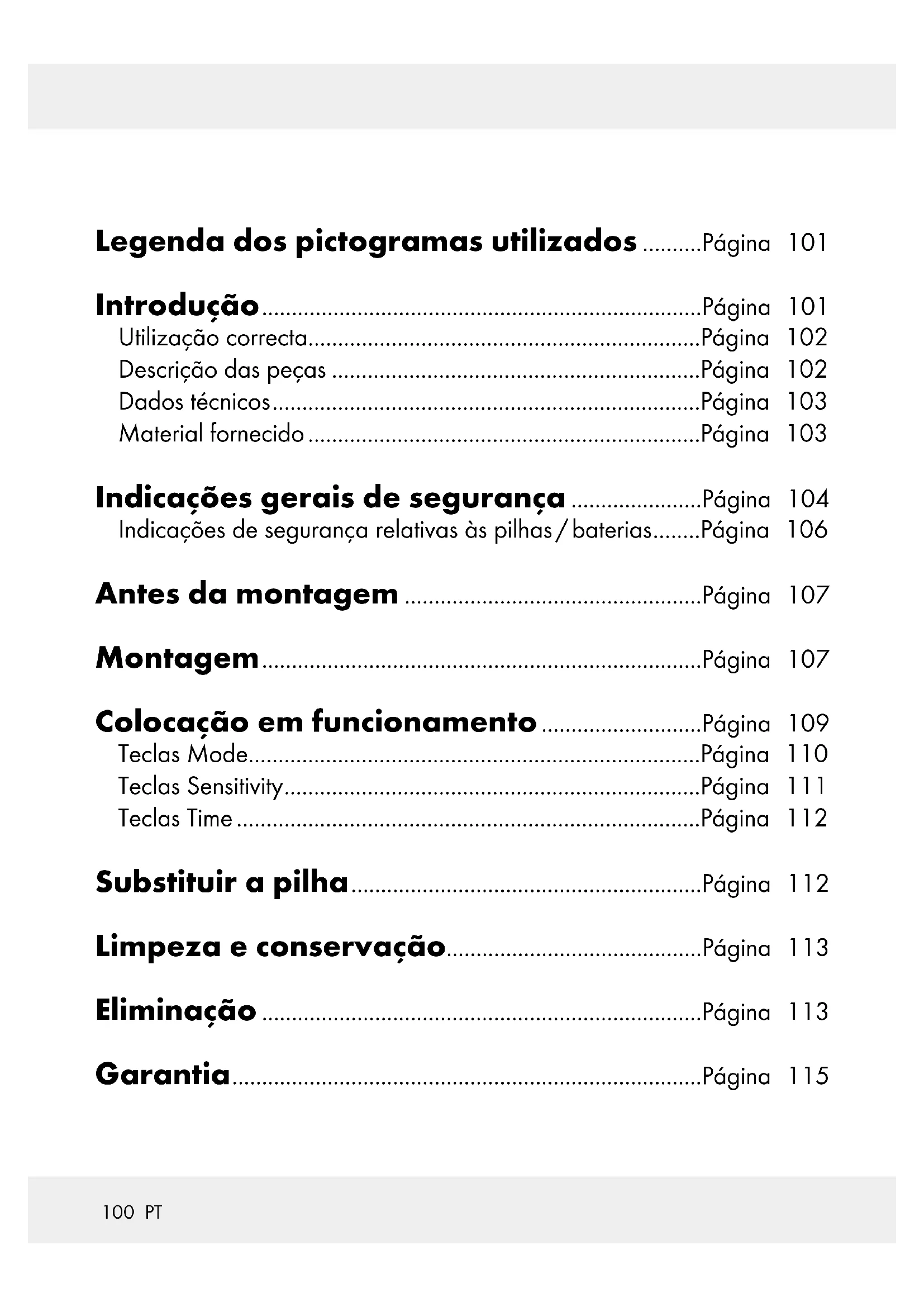 Insira novamente as pilhas. Eliminação A embalagem é feita de materiais não poluentes que podem ser eliminados nos contentores de reciclagem locais.114 PT