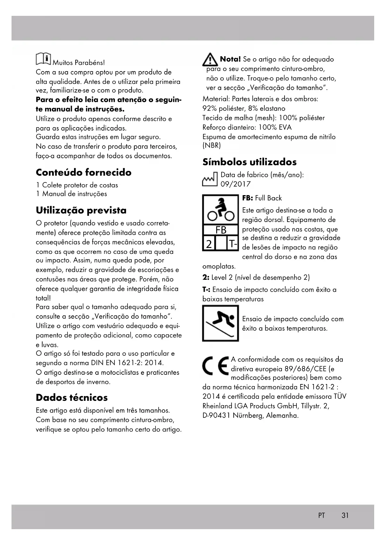 FB: Full Back Este artigo destina-se a toda a região dorsal. Equipamento de proteção usado nas costas, que se destina a reduzir a gravidade de lesões de impacto na região central do dorso e na zona das omoplatas. 2: Level 2 (nível de desempenho 2) T-: Ensaio de impacto concluído com êxito a baixas temperaturas Ensaio de impacto concluído com êxito a baixas temperaturas. A conformidade com os requisitos da diretiva europeia 89/686/CEE (e modificações posteriores) bem como da norma técnica harmonizada EN 1621-2 : 2014 é certificada pela entidade emissora TÜV Rheinland LGA Products GmbH, Tillystr. 2, D-90431 Nürnberg, Alemanha. Muitos Parabéns! Com a sua compra optou por um produto de alta qualidade. Antes de o utilizar pela primeira vez, familiarize-se o com o produto. Para o efeito leia com atenção o seguin- te manual de instruções. Utilize o produto apenas conforme descrito e para as aplicações indicadas. Guarda estas instruções em lugar seguro. No caso de transferir o produto para terceiros, faço-a acompanhar de todos os documentos. Conteúdo fornecido 1 Colete protetor de costas 1 Manual de instruções Utilização prevista O protetor (quando vestido e usado correta- mente) oferece proteção limitada contra as consequências de forças mecânicas elevadas, como as que ocorrem no caso de uma queda ou impacto. Assim, numa queda pode, por exemplo, reduzir a gravidade de escoriações e contusões nas áreas que protege. Porém, não oferece qualquer garantia de integridade física total! Para saber qual o tamanho adequado para si, consulte a secção „Verificação do tamanho“. Utilize o artigo com vestuário adequado e equi- pamento de proteção adicional, como capacete e luvas. O artigo só foi testado para o uso particular e segundo a norma DIN EN 1621-2: 2014. O artigo destina-se a motociclistas e praticantes de desportos de inverno. Dados técnicos Este artigo está disponível em três tamanhos. Com base no seu comprimento cintura-ombro, verifique se optou pelo tamanho certo do artigo. PT32 Indicações de segurança