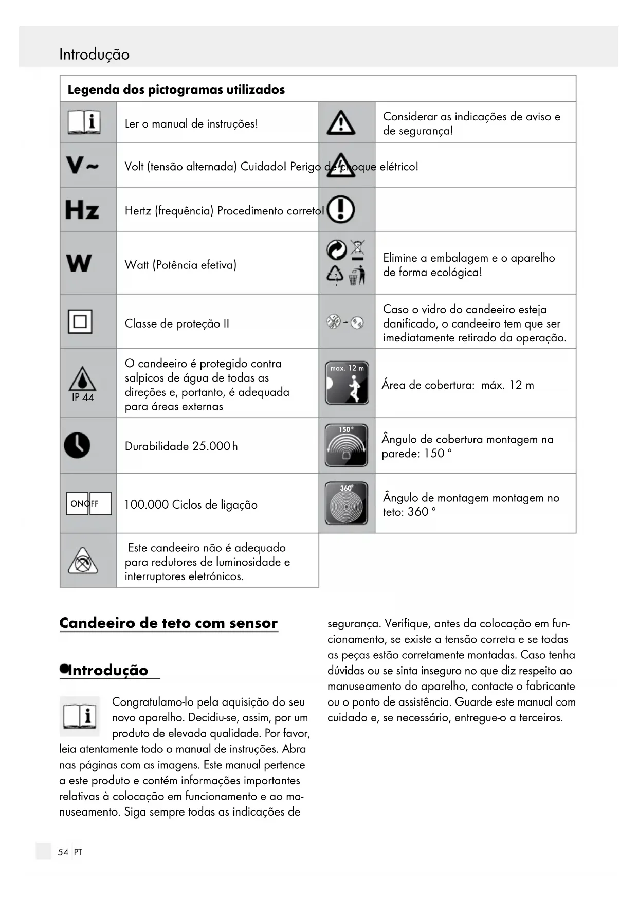Ângulo de montagem montagem no teto: 360 ° Este candeeiro não é adequado para redutores de luminosidade e interruptores eletrónicos. Candeeiro de teto com sensor Introdução Congratulamo-lo pela aquisição do seu novo aparelho. Decidiu-se, assim, por um produto de elevada qualidade. Por favor, leia atentamente todo o manual de instruções. Abra nas páginas com as imagens. Este manual pertence a este produto e contém informações importantes relativas à colocação em funcionamento e ao ma- nuseamento. Siga sempre todas as indicações de segurança. Verifique, antes da colocação em fun- cionamento, se existe a tensão correta e se todas as peças estão corretamente montadas. Caso tenha dúvidas ou se sinta inseguro no que diz respeito ao manuseamento do aparelho, contacte o fabricante ou o ponto de assistência. Guarde este manual com cuidado e, se necessário, entregue-o a terceiros. Introdução Introdução / Segurança55 PT Utilização correcta Este candeeiro é para a utilização no interior e áreas externas. Este pode ser fixado em qualquer superfície normalmente inflamável. O eletricista que instala a lâmpada precisa estar atento para que ela não seja instalada sobre superfícies humidas ou condutoras! Este aparelho destina-se apenas ao uso doméstico e privado. Material fornecido Após desembalar o aparelho, verifique sempre o material fornecido quanto à integridade, bem como ao estado do aparelho. 1 Candeeiro de teto com sensor 1 Lâmpada LED (5,5 W, E27) (não regulável) Material de montagem (buchas e parafusos) 1 Manual de instruções Descrição das peças