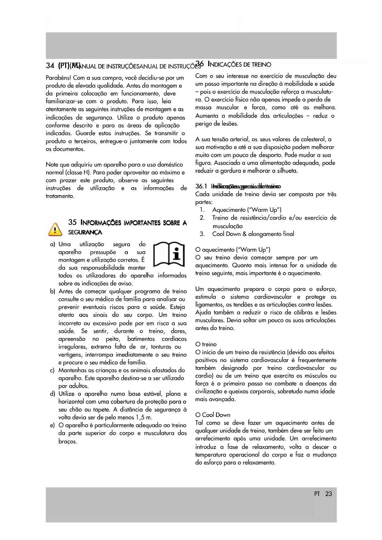 O aquecimento („Warm Up‰) O seu treino devia começar sempre por um aquecimento. Quanto mais intensa for a unidade de treino seguinte, mais importante é o aquecimento. Um aquecimento prepara o corpo para o esforço, estimula o sistema cardiovascular e protege os ligamentos, os tendões e as articulações contra lesões. Ajuda também a reduzir o risco de cãibras e lesões musculares. Devia soltar um pouco as suas articulações antes do treino. O treino O início de um treino de resistência (devido aos efeitos positivos no sistema cardiovascular é frequentemente também designado por treino cardiovascular ou cardio) ou de um treino que exercita os músculos ou força é o primeiro passo no combate a doenças da civilização e queixas corporais, sobretudo numa idade mais avançada. O Cool Down Tal como se deve fazer um aquecimento antes de qualquer unidade de treino, também deve ser feito um arrefecimento após uma unidade. Um arrefecimento introduz a fase de relaxamento, volta a descer a temperatura operacional do corpo e faz a mudança do esforço para o relaxamento.PT