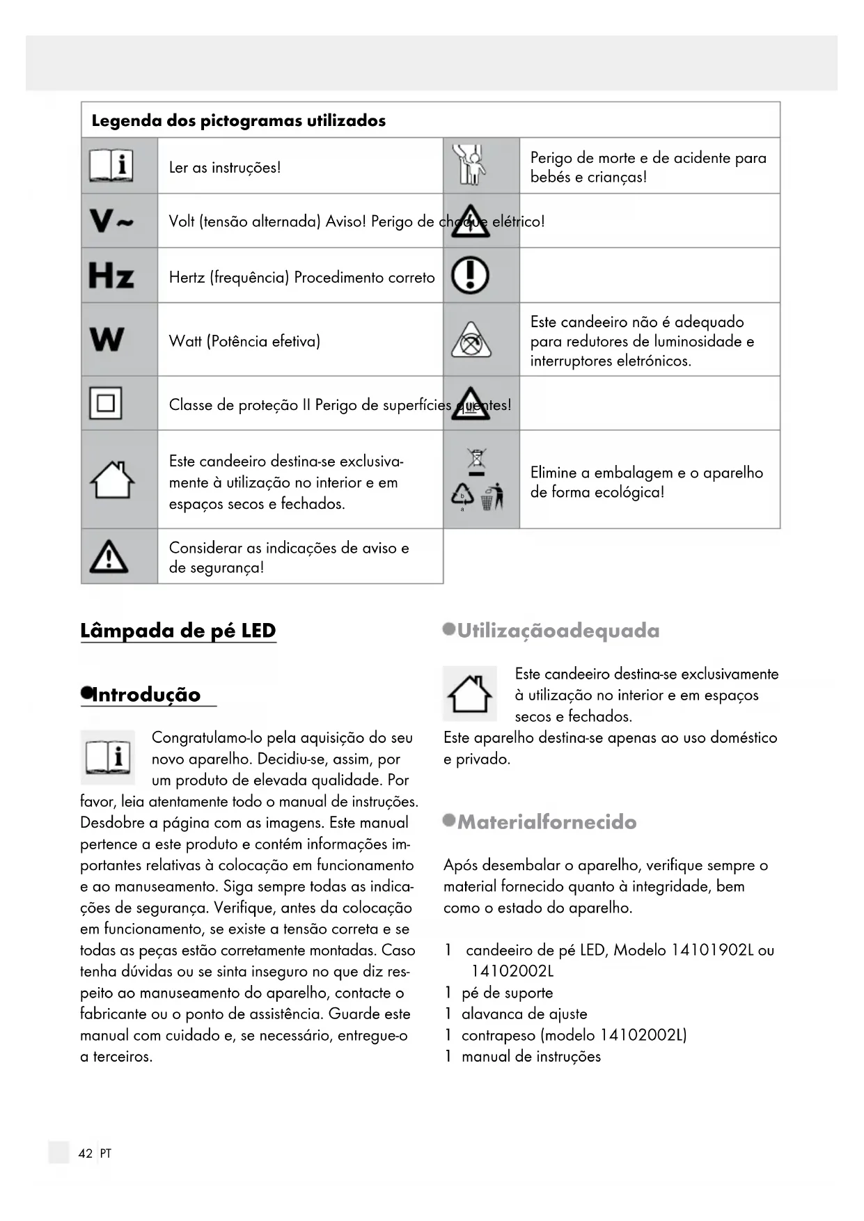 Elimine a embalagem e o aparelho de forma ecológica! Considerar as indicações de aviso e de segurança! Lâmpada de pé LED Introdução Congratulamo-lo pela aquisição do seu novo aparelho. Decidiu-se, assim, por um produto de elevada qualidade. Por favor, leia atentamente todo o manual de instruções. Desdobre a página com as imagens. Este manual pertence a este produto e contém informações im- portantes relativas à colocação em funcionamento e ao manuseamento. Siga sempre todas as indica- ções de segurança. Verifique, antes da colocação em funcionamento, se existe a tensão correta e se todas as peças estão corretamente montadas. Caso tenha dúvidas ou se sinta inseguro no que diz res- peito ao manuseamento do aparelho, contacte o fabricante ou o ponto de assistência. Guarde este manual com cuidado e, se necessário, entregue-o a terceiros. Utilização adequada Este candeeiro destina-se exclusivamente à utilização no interior e em espaços secos e fechados. Este aparelho destina-se apenas ao uso doméstico e privado. Material fornecido Após desembalar o aparelho, verifique sempre o material fornecido quanto à integridade, bem como o estado do aparelho. 1 candeeiro de pé LED, Modelo 14101902L ou 14102002L 1 pé de suporte 1 alavanca de ajuste 1 contrapeso (modelo 14102002L) 1 manual de instruções43 PT Introdução / Segurança Introdução Descrição das peças