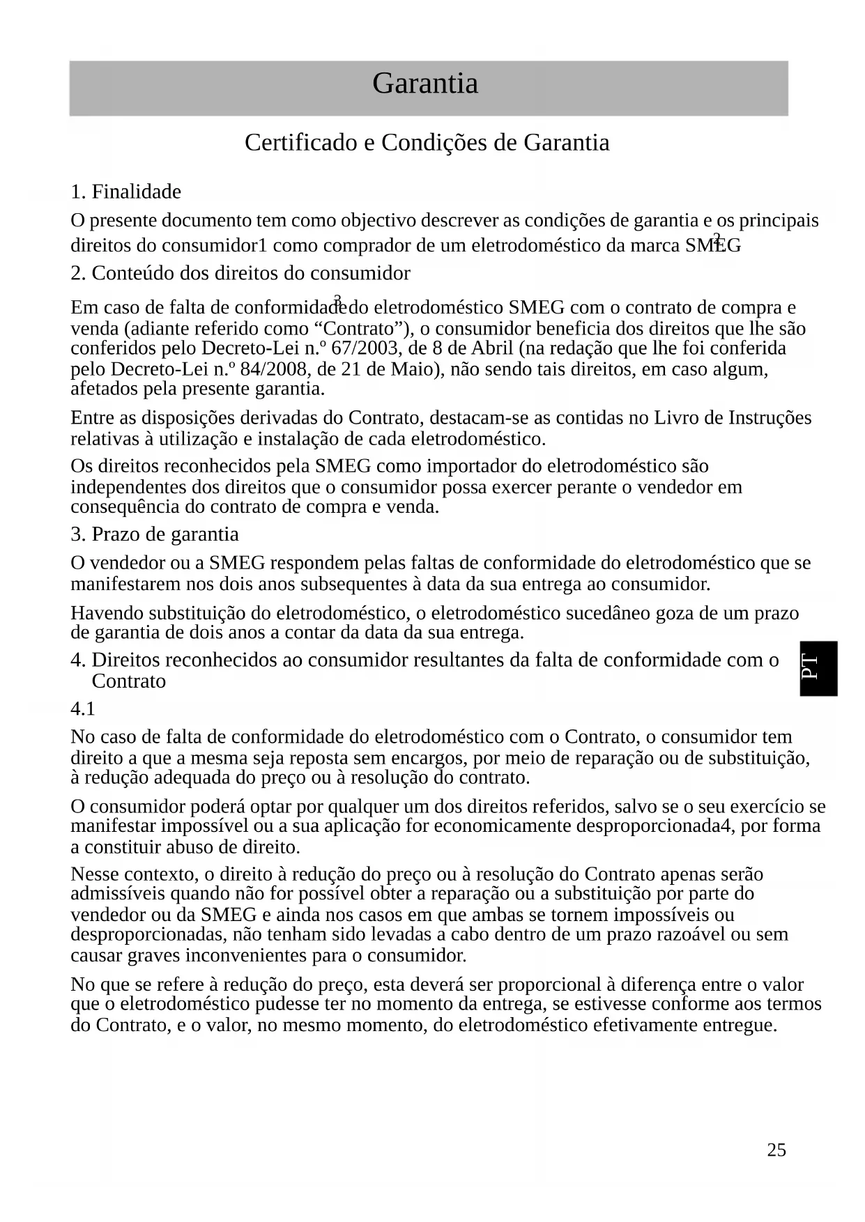 do eletrodoméstico SMEG com o contrato de compra e venda (adiante referido como “Contrato”), o consumidor beneficia dos direitos que lhe são conferidos pelo Decreto-Lei n.º 67/2003, de 8 de Abril (na redação que lhe foi conferida pelo Decreto-Lei n.º 84/2008, de 21 de Maio), não sendo tais direitos, em caso algum, afetados pela presente garantia. Entre as disposições derivadas do Contrato, destacam-se as contidas no Livro de Instruções relativas à utilização e instalação de cada eletrodoméstico. Os direitos reconhecidos pela SMEG como importador do eletrodoméstico são independentes dos direitos que o consumidor possa exercer perante o vendedor em consequência do contrato de compra e venda.