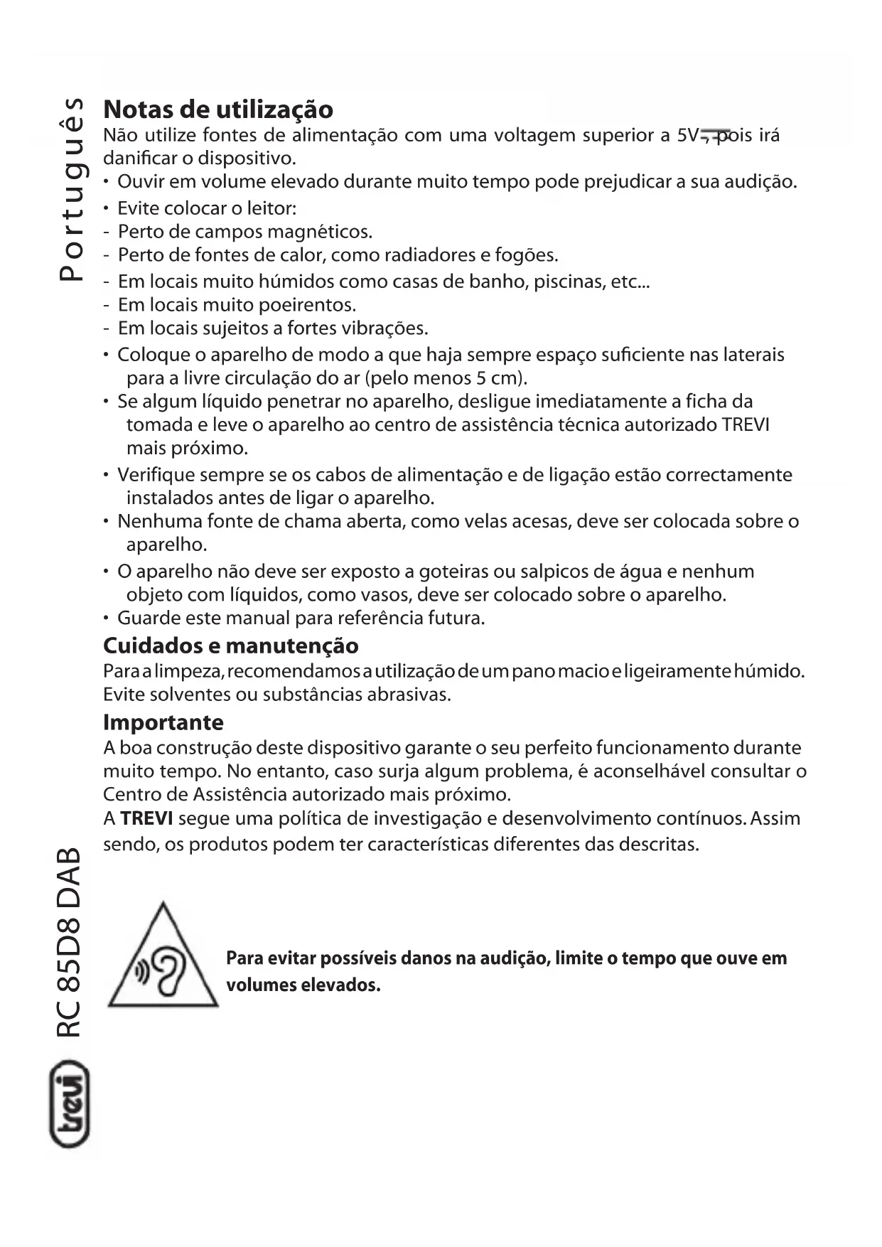 - Guarde este manual para referência futura. Cuidados e manutenção Para a limpeza, recomendamos a utilização de um pano macio e ligeiramente húmido. Evite solventes ou substâncias abrasivas. Importante A boa construção deste dispositivo garante o seu perfeito funcionamento durante muito tempo. No entanto, caso surja algum problema, é aconselhável consultar o Centro de Assistência autorizado mais próximo. A TREVI segue uma política de investigação e desenvolvimento contínuos. Assim sendo, os produtos podem ter características diferentes das descritas. Português Para evitar possíveis danos na audição, limite o tempo que ouve em volumes elevados.RC 85D8 DAB