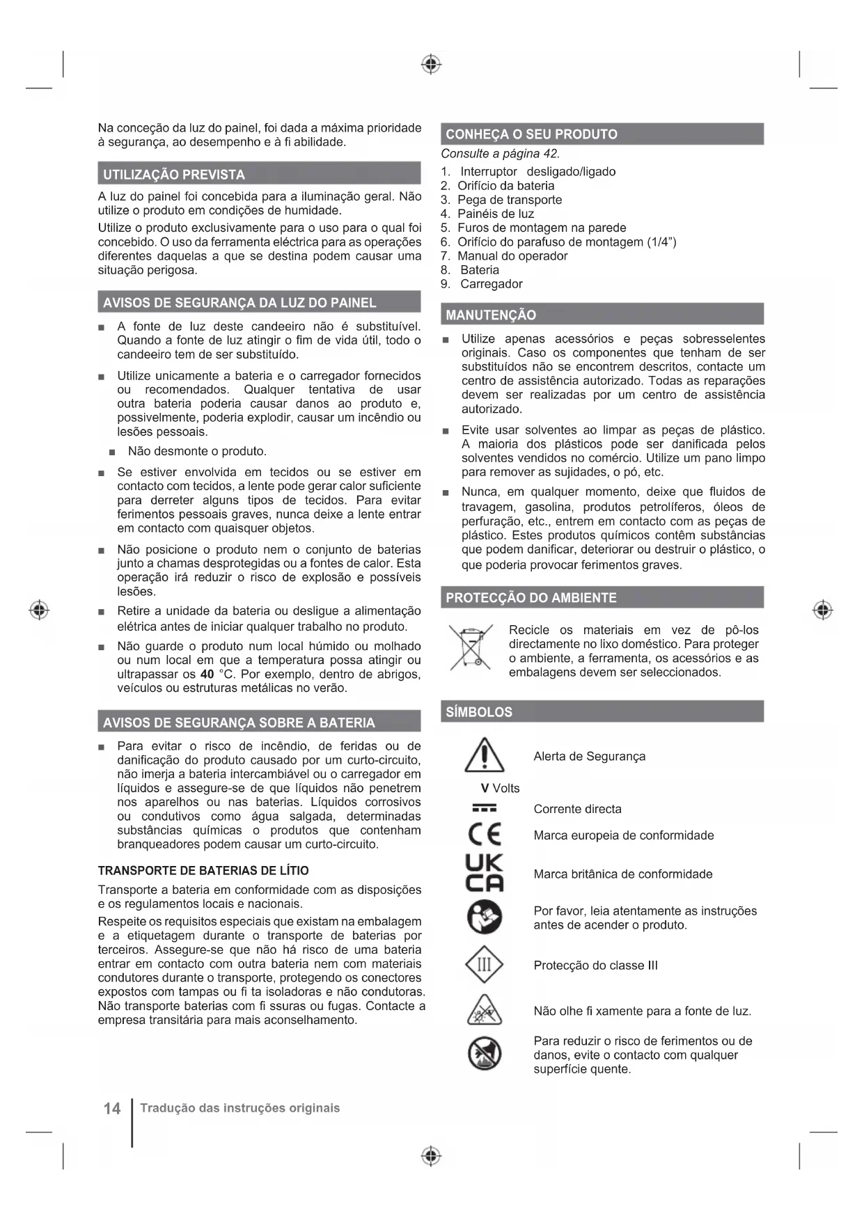 Recicle os materiais em vez de pô-los directamente no lixo doméstico. Para proteger o ambiente, a ferramenta, os acessórios e as embalagens devem ser seleccionados. SÍMBOLOS Alerta de Segurança V Volts Corrente directa Marca europeia de conformidade Marca britânica de conformidade Por favor, leia atentamente as instruções antes de acender o produto. Protecção do classe III Não olhe fi xamente para a fonte de luz. Para reduzir o risco de ferimentos ou de danos, evite o contacto com qualquer superfície quente.