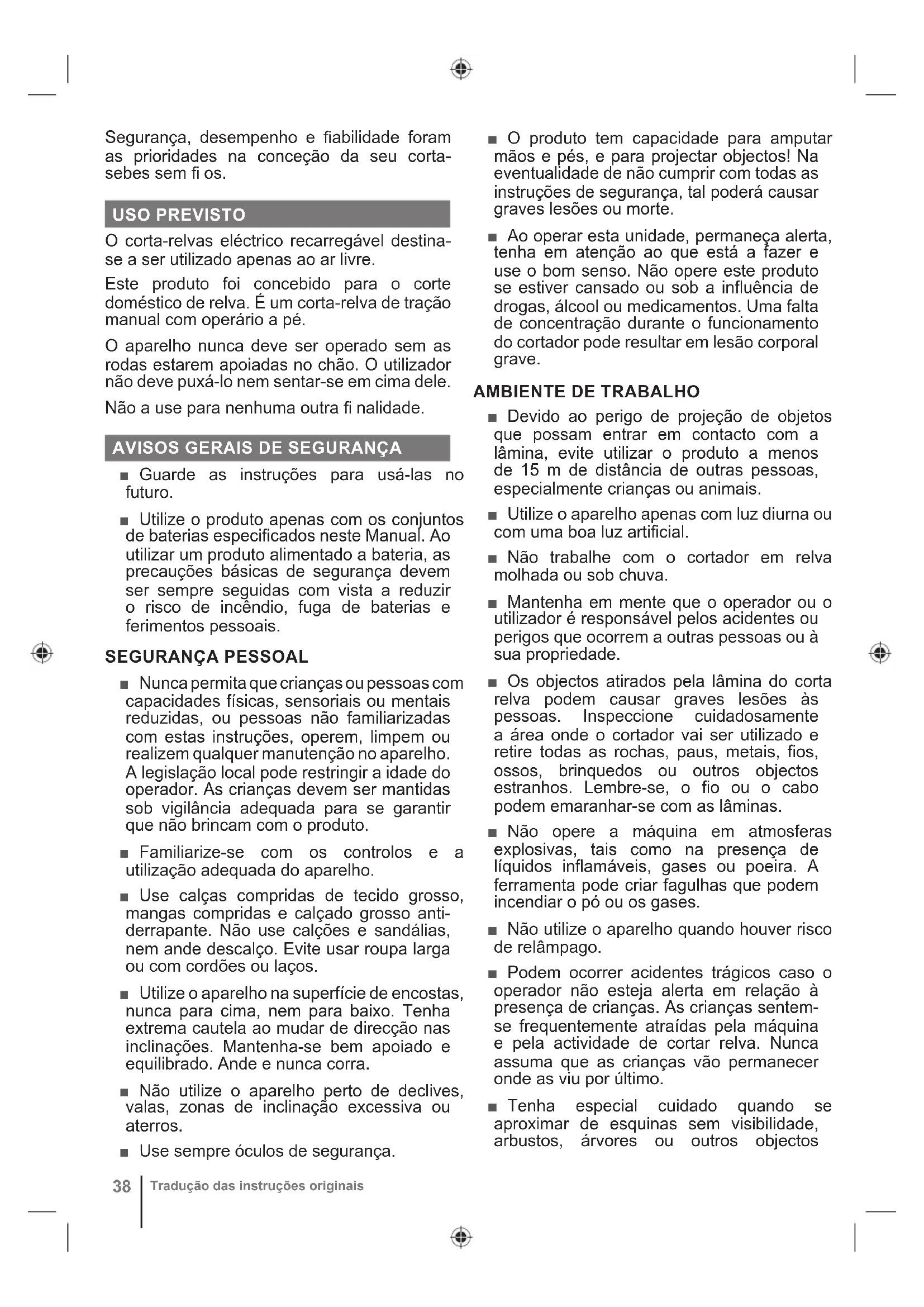 GEBRUIKSAANWIJZING Onderdelen of accessoires afzonderlijk verkocht Opmerking Waarschuwing38 Tradução das instruções originais Segurança, desempenho e fi abilidade foram as prioridades na conceção da seu corta- sebes sem fi os. USO PREVISTO O corta-relvas eléctrico recarregável destina- se a ser utilizado apenas ao ar livre. Este produto foi concebido para o corte doméstico de relva. É um corta-relva de tração manual com operário a pé. O aparelho nunca deve ser operado sem as rodas estarem apoiadas no chão. O utilizador não deve puxá-lo nem sentar-se em cima dele. Não a use para nenhuma outra fi nalidade.