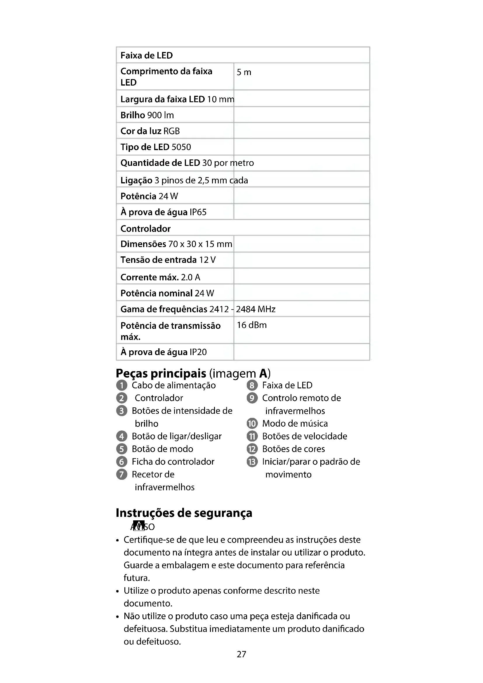 Guia de iniciação rápida Faixa LED Smart Wi-Fi WIFILS51CRGBPara mais informações, consulte a versão alargada do manual on-line: ned.is/wils51crgb Utilização prevista Este produto é uma faixa LED Smart Wi-Fi com controlo remoto sem os.O produto não se destina a utilização prossional.Este produto destina-se a ser utilizado em interiores e exteriores.Qualquer alteração do produto pode ter consequências em termos de segurança, garantia e funcionamento adequado. Especicações Produto Faixa LED Smart Wi-FiNúmero de artigo WIFILS51CRGB27 Faixa de LED Comprimento da faixa LED 5 m Largura da faixa LED 10 mm Brilho 900 lm Cor da luz RGB Tipo de LED 5050 Quantidade de LED 30 por metro Ligação 3 pinos de 2,5 mm cada Potência 24 W À prova de água IP65 Controlador Dimensões 70 x 30 x 15 mm Tensão de entrada 12 V Corrente máx. 2.0 A Potência nominal 24 W Gama de frequências 2412 - 2484 MHz Potência de transmissão máx. 16 dBm À prova de água IP20 Peças principais (imagem A) 1 Cabo de alimentação 2 Controlador 3 Botões de intensidade de brilho 4 Botão de ligar/desligar 5 Botão de modo 6 Ficha do controlador 7 Recetor de infravermelhos 8 Faixa de LED 9 Controlo remoto de infravermelhos q Modo de música w Botões de velocidade e Botões de cores r Iniciar/parar o padrão de movimento Instruções de segurança
