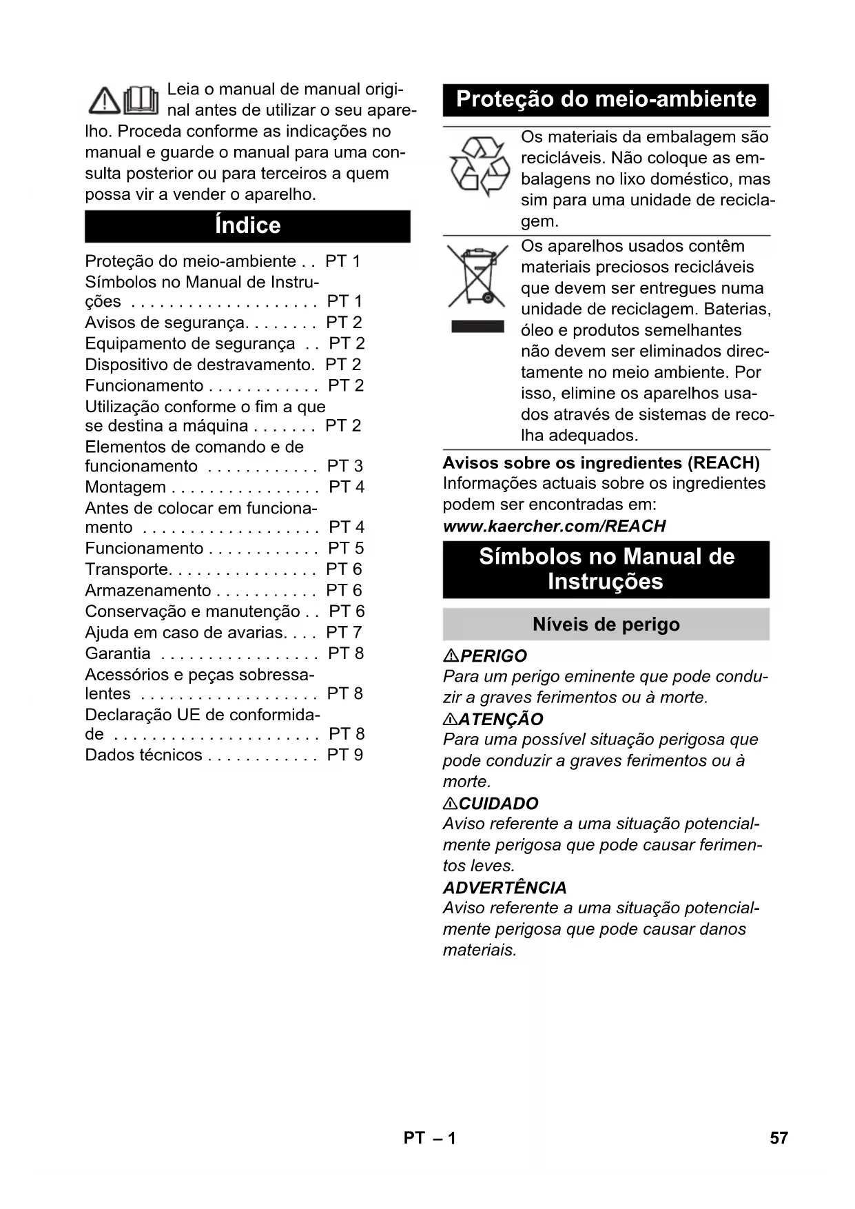 Emisión sonora Nivel de presión acústica (EN 60704-1) dB(A) 56 61,3 Vibraciones del aparato Valor total de la vibración (ISO 5349) m/s² 0,35 0,78 56 ES– 1 Leia o manual de manual origi- nal antes de utilizar o seu apare- lho. Proceda conforme as indicações no manual e guarde o manual para uma con- sulta posterior ou para terceiros a quem possa vir a vender o aparelho. Avisos sobre os ingredientes (REACH) Informações actuais sobre os ingredientes podem ser encontradas em: www.kaercher.com/REACH PERIGO Para um perigo eminente que pode condu- zir a graves ferimentos ou à morte. 몇 ATENÇÃO Para uma possível situação perigosa que pode conduzir a graves ferimentos ou à morte. 몇 CUIDADO Aviso referente a uma situação potencial- mente perigosa que pode causar ferimen- tos leves. ADVERTÊNCIA Aviso referente a uma situação potencial- mente perigosa que pode causar danos materiais. Índice Proteção do meio-ambiente . . PT 1 Símbolos no Manual de Instru- ções . . . . . . . . . . . . . . . . . . . . PT 1 Avisos de segurança. . . . . . . . PT 2 Equipamento de segurança . . PT 2 Dispositivo de destravamento. PT 2 Funcionamento . . . . . . . . . . . . PT 2 Utilização conforme o fim a que se destina a máquina . . . . . . . PT 2 Elementos de comando e de funcionamento . . . . . . . . . . . . PT 3 Montagem . . . . . . . . . . . . . . . . PT 4 Antes de colocar em funciona- mento . . . . . . . . . . . . . . . . . . . PT 4 Funcionamento . . . . . . . . . . . . PT 5 Transporte. . . . . . . . . . . . . . . . PT 6 Armazenamento . . . . . . . . . . . PT 6 Conservação e manutenção . . PT 6 Ajuda em caso de avarias. . . . PT 7 Garantia . . . . . . . . . . . . . . . . . PT 8 Acessórios e peças sobressa- lentes . . . . . . . . . . . . . . . . . . . PT 8 Declaração UE de conformida- de . . . . . . . . . . . . . . . . . . . . . . PT 8 Dados técnicos . . . . . . . . . . . . PT 9 Proteção do meio-ambiente Os materiais da embalagem são recicláveis. Não coloque as em- balagens no lixo doméstico, mas sim para uma unidade de recicla- gem. Os aparelhos usados contêm materiais preciosos recicláveis que devem ser entregues numa unidade de reciclagem. Baterias, óleo e produtos semelhantes não devem ser eliminados direc- tamente no meio ambiente. Por isso, elimine os aparelhos usa- dos através de sistemas de reco- lha adequados. Símbolos no Manual de Instruções Níveis de perigo 57PT– 2 Antes da primeira utilização do aparelho, leia este manual de operação e a brochura anexa "Indicações de segurança para má- quinas de um disco Disc", n.º 5.956-659 e proceda conforme as indicações. Os dispositivos de segurança destinam-se a proteger o utilizador e não devem, por is- so, ser anulados ou evitado o seu funciona- mento. Impede a activação inadvertida do apare- lho. O aparelho é utilizado para o polimento de soalhos planos. O pó produzido durante o polimento é reco- lhido por um saco de filtro substituível. – Uma largura de trabalho de 500 mm permite uma aplicação eficaz. – A alimentação pela rede permite um alto rendimento sem limitar o tempo operacional. Utilize este aparelho exclusivamente em conformidade com as indicações destas Instruções de Serviço. – O aparelho só pode ser utilizado para o polimento de pavimentos lisos. – O aparelho só pode ser equipado com acessórios e peças sobressalentes ori- ginais. – O aparelho não é indicado para a utili- zação em locais com perigo de explo- sões. – Este aparelho destina-se somente para a aplicação em produtos secos e não pode ser utilizado nem guardado ao ar livre sob condições húmidas. Avisos de segurança Equipamento de segurança Dispositivo de destravamento Funcionamento Utilização conforme o fim a que se destina a máquina 58 PT– 3 1 Interruptor direita 2 Alavanca para ajuste da inclinação 3 Cabo de rede com ficha 4 Tomada (apenas para acessórios auto- rizados pelo fabricante) 5 Interruptor esquerda 6 Desbloqueio esquerda 7 Lâmpada de controlo "Tensão de rede existente" 8 Desbloqueio direita 9 Punho 10 Gancho de cabos, rotativo 11 Ligação de encaixe do cabo de coman-
