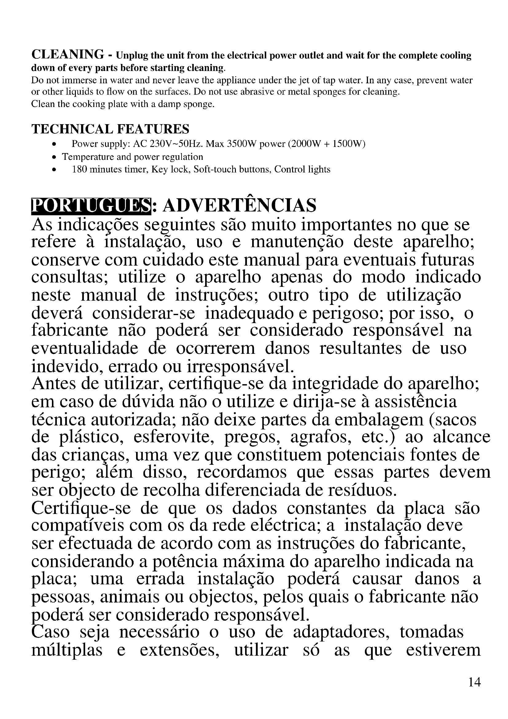 LIMPEZA Desligar a ficha da tomada elétrica e deixar arrefecer antes de efetuar qualquer operação de limpeza. Não mergulhar o aparelho em água, nem deixa-lo sob o jato da torneira e evitar que a água ou outros líquidos deslizem sobre a superfície de confeção. Não utilizar esponjas abrasivas ou metálicas para a limpeza. Limpar as superfícies do aparelho com uma esponja húmida. CARACTERISTICAS TECNICAS