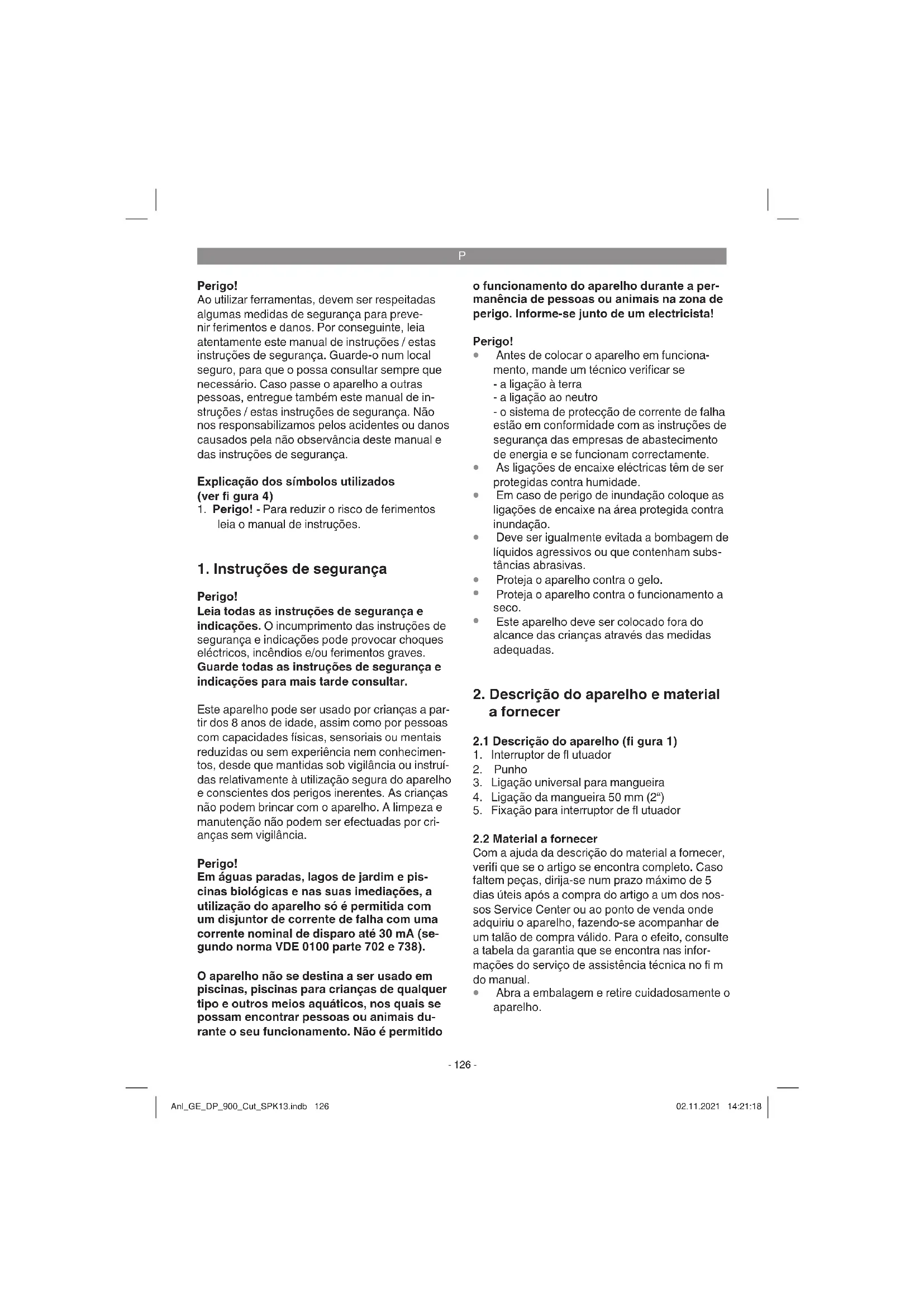 Perigo! Leia todas as instruções de segurança e indicações. O incumprimento das instruções de segurança e indicações pode provocar choques eléctricos, incêndios e/ou ferimentos graves. Guarde todas as instruções de segurança e indicações para mais tarde consultar. Este aparelho pode ser usado por crianças a par- tir dos 8 anos de idade, assim como por pessoas com capacidades físicas, sensoriais ou mentais reduzidas ou sem experiência nem conhecimen- tos, desde que mantidas sob vigilância ou instruí- das relativamente à utilização segura do aparelho e conscientes dos perigos inerentes. As crianças não podem brincar com o aparelho. A limpeza e manutenção não podem ser efectuadas por cri- anças sem vigilância. Perigo! Em águas paradas, lagos de jardim e pis- cinas biológicas e nas suas imediações, a utilização do aparelho só é permitida com um disjuntor de corrente de falha com uma corrente nominal de disparo até 30 mA (se- gundo norma VDE 0100 parte 702 e 738). O aparelho não se destina a ser usado em piscinas, piscinas para crianças de qualquer tipo e outros meios aquáticos, nos quais se possam encontrar pessoas ou animais du- rante o seu funcionamento. Não é permitido o funcionamento do aparelho durante a per- manência de pessoas ou animais na zona de perigo. Informe-se junto de um electricista! Perigo!