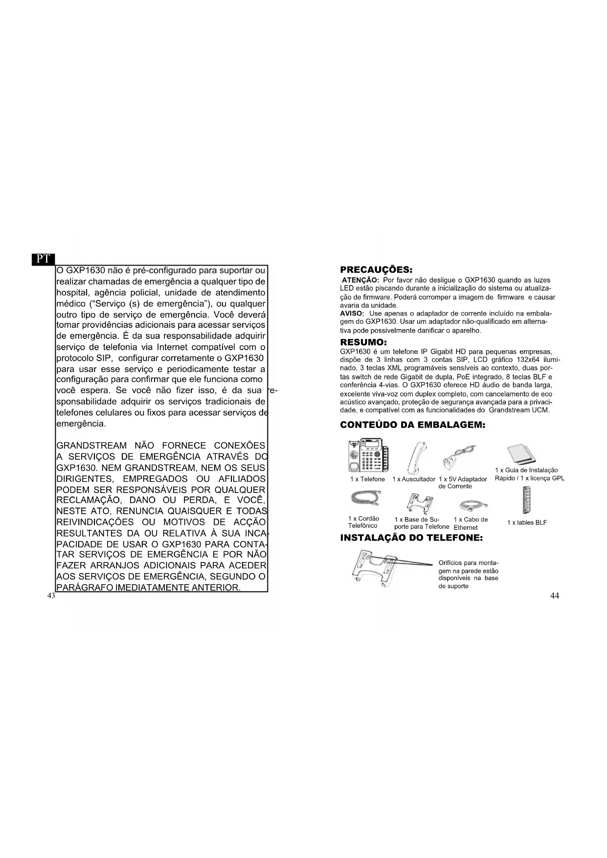 GXP1630 é um telefone IP Gigabit HD para pequenas empresas, dispõe de 3 linhas com 3 contas SIP, LCD gráfico 132x64 ilumi- nado, 3 teclas XML programáveis sensíveis ao contexto, duas por- tas switch de rede Gigabit de dupla, PoE integrado, 8 teclas BLF e conferência 4-vias. O GXP1630 oferece HD áudio de banda larga, excelente viva-voz com duplex completo, com cancelamento de eco acústico avançado, proteção de segurança avançada para a privaci- dade, e compatível com as funcionalidades do Grandstream UCM. CONTEÚdO dA EMBALAGEM: RESUMO: ATENÇÃO: Por favor não desligue o GXP1630 quando as luzes LED estão piscando durante a inicialização do sistema ou atualiza- ção de firmware. Poderá corromper a imagem de firmware e causar avaria da unidade. PRECAUÇÕES: AvISO: Use apenas o adaptador de corrente incluído na embala- gem do GXP1630. Usar um adaptador não-qualificado em alterna- tiva pode possivelmente danificar o aparelho. 1 x Telefone 1 x Auscultador 1 x Cordão Telefônico 1 x Cabo de Ethernet 1 x Base de Su- porte para Telefone 1 x 5V Adaptador de Corrente 1 x Guia de Instalação Rápido / 1 x licença GPL GXP1630 5 V INSTALAÇÃO dO TELEFONE: Orifícios para monta- gem na parede estão disponíveis na base de suporte 1 x lables BLF45 Instalação do Telefone (Base de Suporte): Instalação do Telefone (Montagem na Parede): LIGANdO O TELEFONE: