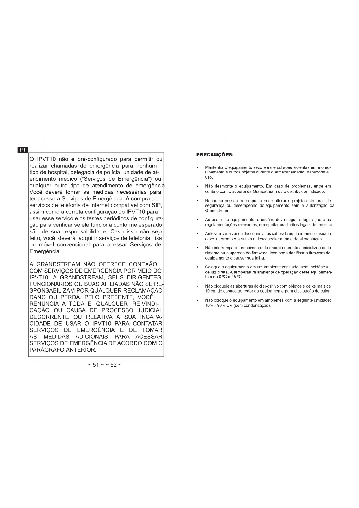 A GRANDSTREAM NÃO OFERECE CONEXão COM SERVCIOS DE EMERGÊNCIA POR MEIO DO IPVT10. A GRANDSTREAM, SEUS DIRIGENTES, FUNCIONÁRIOS OU SUAS AFILIADAS NÃO SE RESPONSABILIZAM POR QUALQUER RECLAMAÇÃO DANO OU PERDA. PELO PRESENTE, VOCÉ RENUNCIA A TODA E QUALQUER REIVINDICAZão OU CAUSA DE PROCESSO JUDICIAL DECORRENTE OU RELATIVA A SUA INCAPACIDA DE USAR O IPVT10 PARA CONTATAR SERVCIOS DE EMERGÊNCIA E DE TOMAR AS MEDIDAS ADICIONAIS PARA ACESSAR SERVCIOS DE EMERGÊNCIA DE ACORDO COM O PARÁGRAFO ANTERIOR.