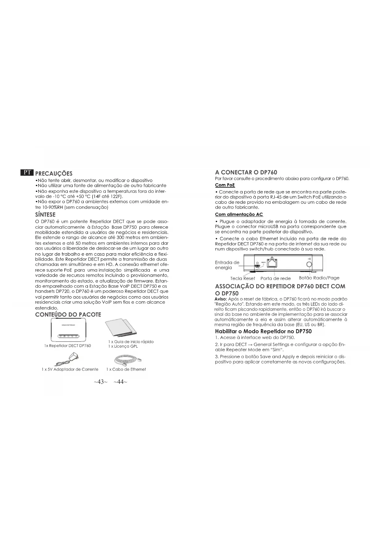 1 x Cabo de Ethernet 1x Repetidor DECT DP760 1 x 5V Adaptador de Corrente 1 x Guia de inicio rápido 1 x Licença GPL SÍNTESE O DP760 é um potente Repetidor DECT que se pode asso- ciar automaticamente à Estação Base DP750 para oferece mobilidade estendida a usuários de negócios e residenciais. Ele estende o rango de alcance até 300 metros em ambien- tes externos e até 50 metros em ambientes internos para dar aos usuários a liberdade de deslocar-se de um lugar ao outro no lugar de trabalho e em casa para maior eficiência e flexi- bilidade. Este Repetidor DECT permite a transmissão de duas chamadas em simultâneo e em HD. A conexão ethernet ofe- rece suporte PoE para uma instalação simplificada e uma variedade de recursos remotos incluindo o provisionamento, monitoramento do estado, e atualização de firmware. Estan- do emparelhado com a Estação Base VoIP DECT DP750 e os handsets DP720, o DP760 é um poderoso Repetidor DECT que vai permitir tanto aos usuários de negócios como aos usuários residenciais criar uma solução VoIP sem fios e com alcance estendido.