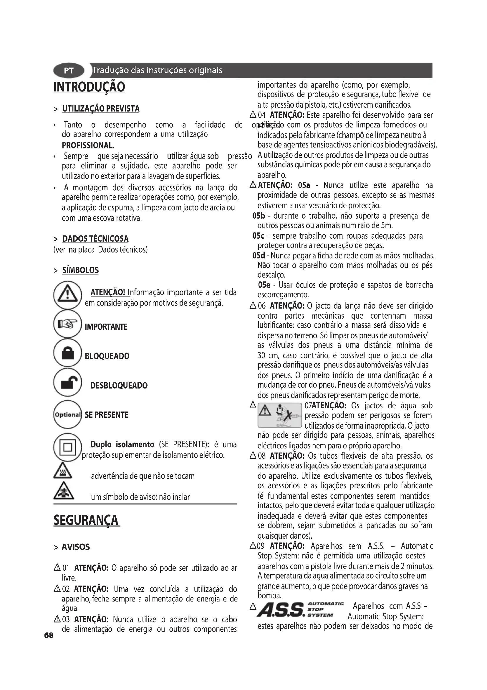 - 09 ATENÇÃO: Aparelhos sem A.S.S. – Automatic Stop System: não é permitida uma utilização destes aparelhos com a pistola livre durante mais de 2 minutos. A temperatura da água alimentada ao circuito sofre um grande aumento, o que pode provocar danos graves na bomba.