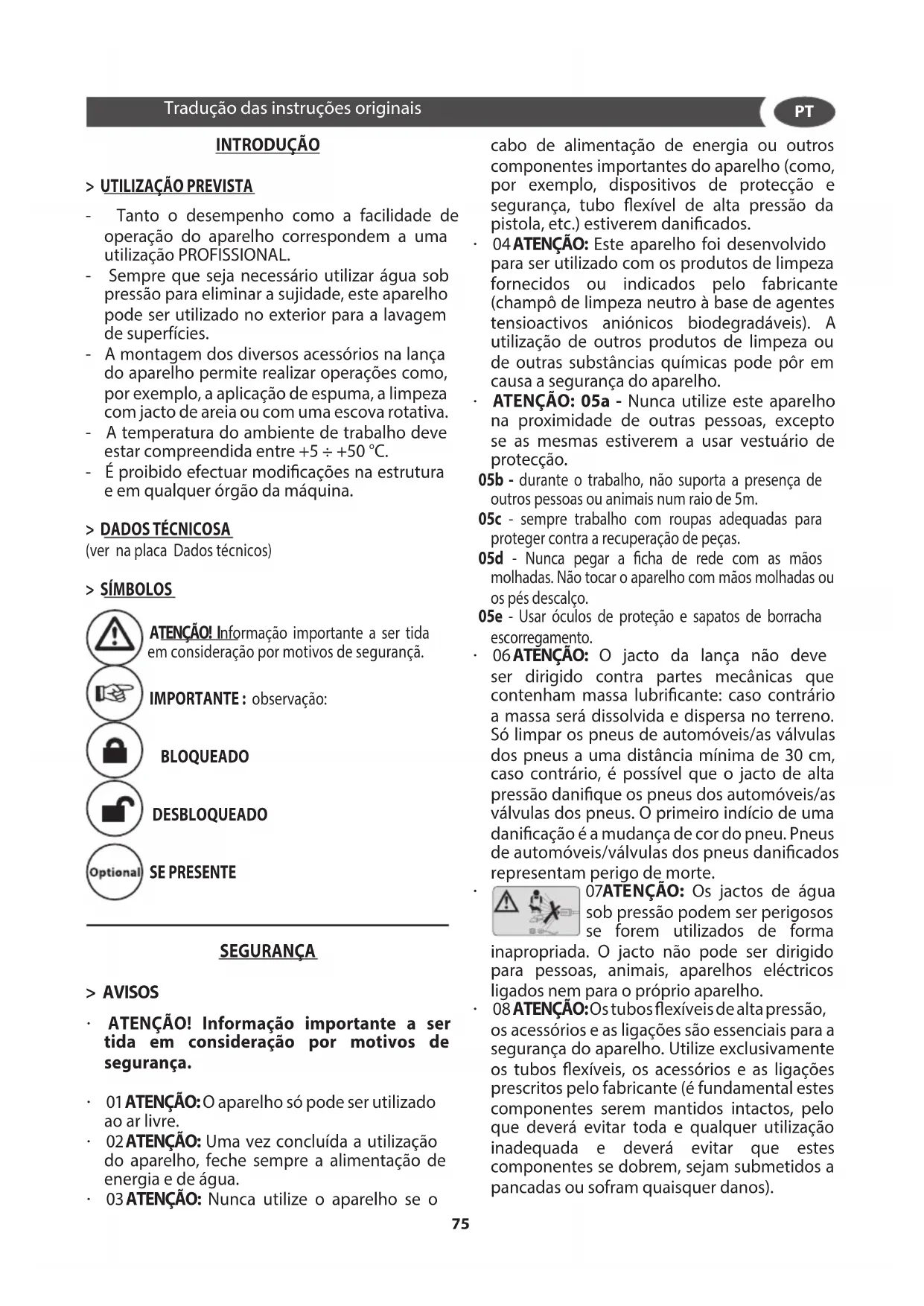 (ver na placa Dados técnicos) > SÍMBOLOS ATENÇÃO! Informação importante a ser tida em consideração por motivos de segurançã. IMPORTANTE : observação: BLOQUEADO DESBLOQUEADO SE PRESENTE SEGURANÇA > AVISOS