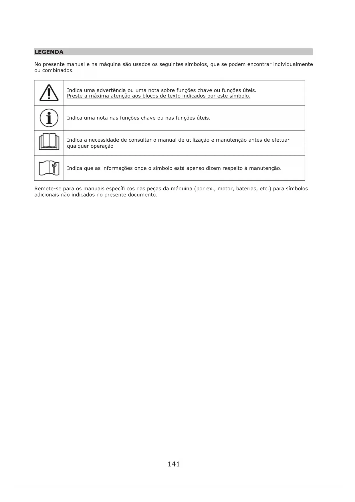 LEGENDA No presente manual e na máquina são usados os seguintes símbolos, que se podem encontrar individualmente ou combinados. Indica uma advertência ou uma nota sobre funções chave ou funções úteis. Preste a máxima atenção aos blocos de texto indicados por este símbolo. Indica uma nota nas funções chave ou nas funções úteis. Indica a necessidade de consultar o manual de utilização e manutenção antes de efetuar qualquer operação Indica que as informações onde o símbolo está apenso dizem respeito à manutenção. Remete-se para os manuais especí cos das peças da máquina (por ex., motor, baterias, etc.) para símbolos adicionais não indicados no presente documento.142