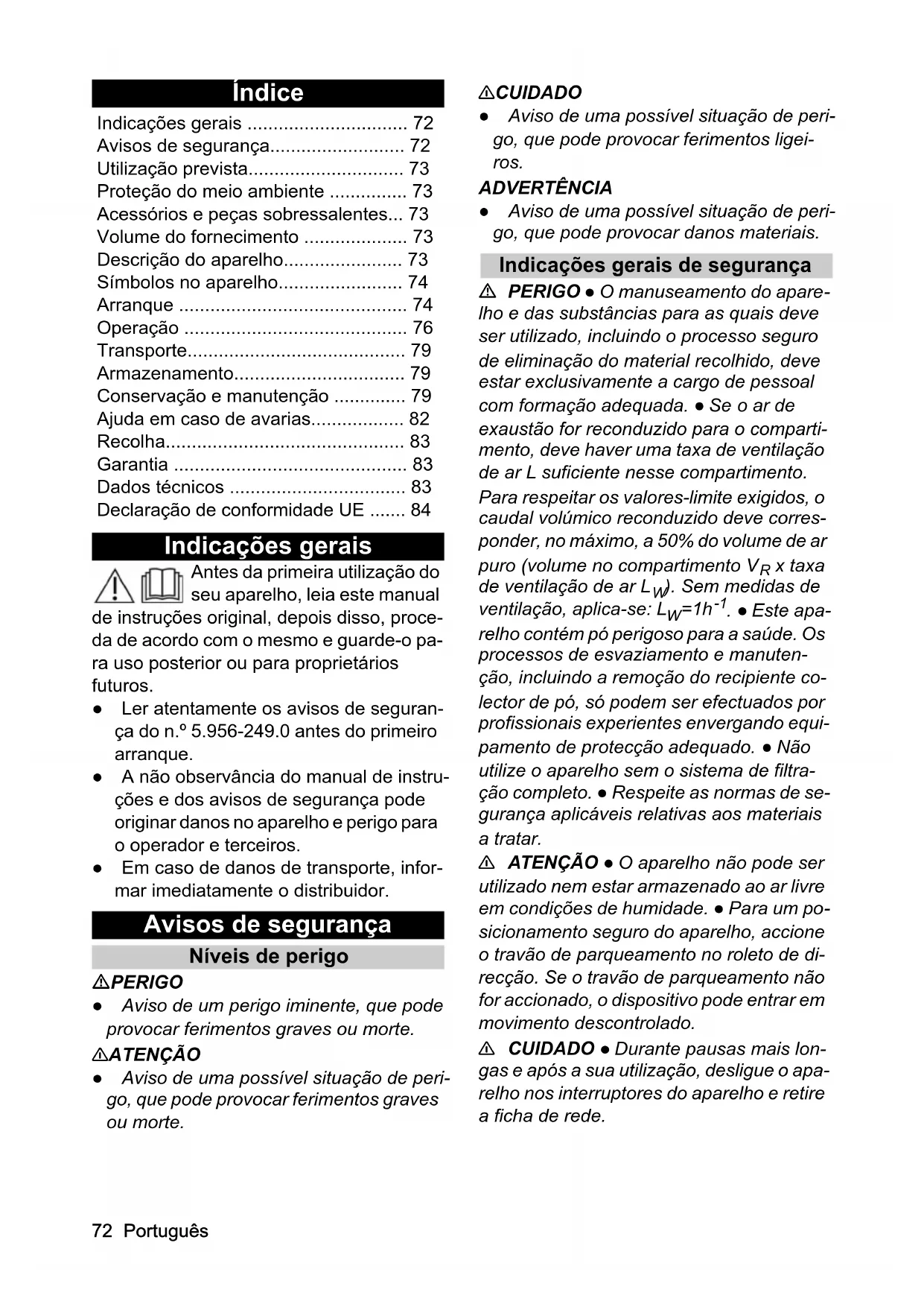 Longitud del cable m 1072 Português Índice Indicações gerais Antes da primeira utilização do seu aparelho, leia este manual de instruções original, depois disso, proce- da de acordo com o mesmo e guarde-o pa- ra uso posterior ou para proprietários futuros. ● Ler atentamente os avisos de seguran- ça do n.º 5.956-249.0 antes do primeiro arranque. ● A não observância do manual de instru- ções e dos avisos de segurança pode originar danos no aparelho e perigo para o operador e terceiros. ● Em caso de danos de transporte, infor- mar imediatamente o distribuidor. Avisos de segurança Níveis de perigo PERIGO ● Aviso de um perigo iminente, que pode provocar ferimentos graves ou morte. 몇 ATENÇÃO ● Aviso de uma possível situação de peri- go, que pode provocar ferimentos graves ou morte. 몇 CUIDADO ● Aviso de uma possível situação de peri- go, que pode provocar ferimentos ligei- ros. ADVERTÊNCIA ● Aviso de uma possível situação de peri- go, que pode provocar danos materiais. Indicações gerais de segurança PERIGO ● O manuseamento do apare- lho e das substâncias para as quais deve ser utilizado, incluindo o processo seguro de eliminação do material recolhido, deve estar exclusivamente a cargo de pessoal com formação adequada. ● Se o ar de exaustão for reconduzido para o comparti- mento, deve haver uma taxa de ventilação de ar L suficiente nesse compartimento. Para respeitar os valores-limite exigidos, o caudal volúmico reconduzido deve corres- ponder, no máximo, a 50% do volume de ar puro (volume no compartimento V